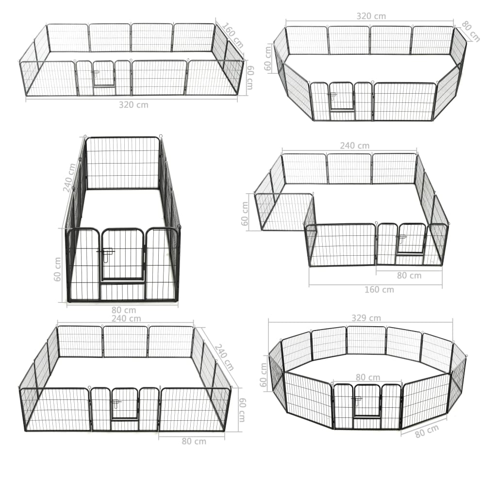Unser vielseitiger Laufstall ist ideal zum Spielen, Trainieren, Ausüben oder einfach nur zum Schutz. Er wird das perfekte Spielparadies für Ihre pelzigen Freunde sein! Dieses Laufgitter kann einfach auf- und abgebaut werden. Es besteht aus 12 hochbelastbaren Paneelen und jedes davon kann einfach am nächsten befestigt werden, so dass Sie den Laufstall in verschiedenen Formen konfigurieren können. Das Hundegehege verfügt über eine Klapptür mit Sicherheitsverriegelung, die für einen einfachen Zugang sorgt. Dieses langlebige und wetterfeste Laufgitter für Hunde ist aus rostfreiem, pulverbeschichtetem Stahl gefertigt und somit für den Einsatz im Außen- und Innenbereich geeignet. Die mitgelieferten Erdspieße dienen der Sicherung des Laufstalls im Freien und sorgen für zusätzliche Stabilität und Sicherheit.