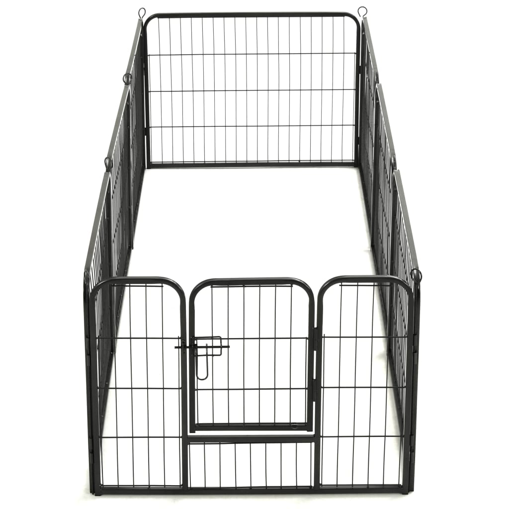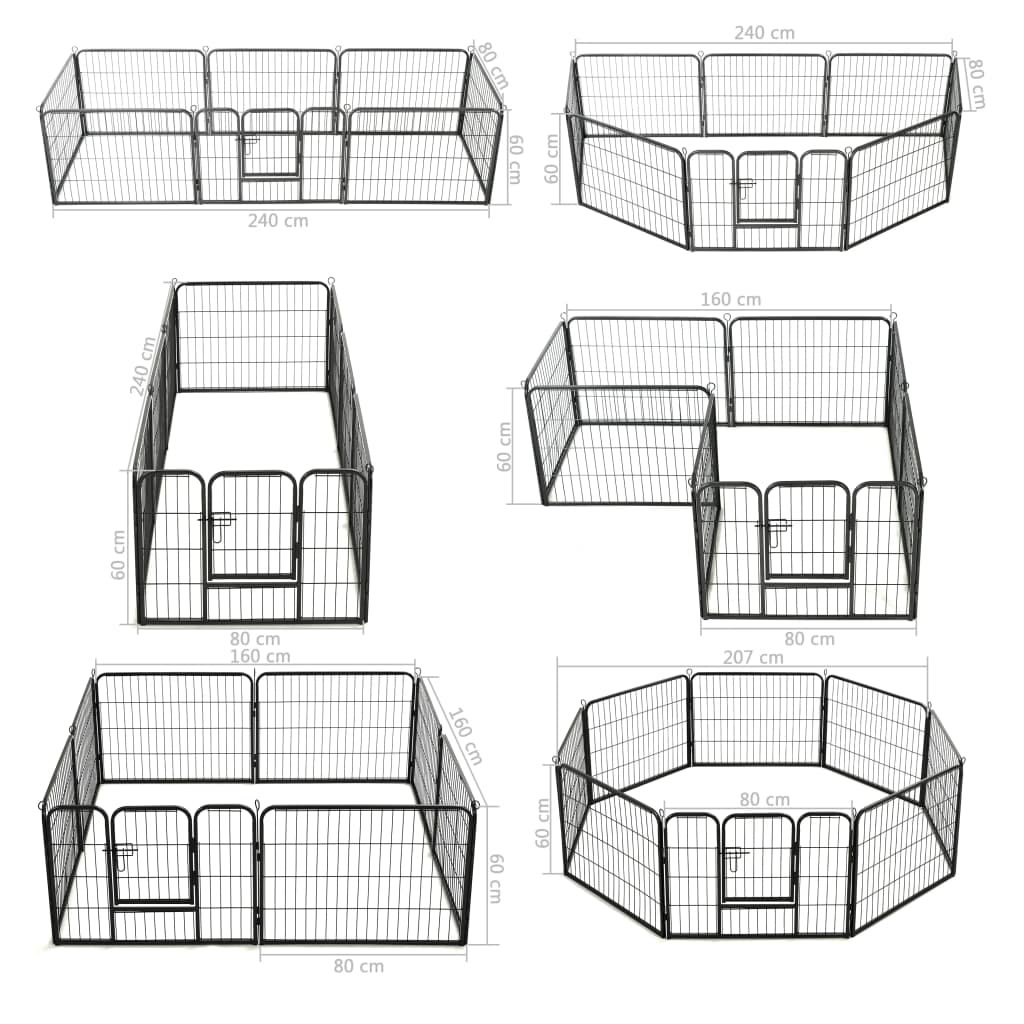 Unser vielseitiger Laufstall ist ideal zum Spielen, Trainieren, Ausüben oder einfach nur zum Schutz. Er wird das perfekte Spielparadies für Ihre pelzigen Freunde sein! Dieses Laufgitter kann einfach auf- und abgebaut werden. Es besteht aus 8 hochbelastbaren Paneelen und jedes davon kann einfach am nächsten befestigt werden, so dass Sie den Laufstall in verschiedenen Formen konfigurieren können. Das Hundegehege verfügt über eine Klapptür mit Sicherheitsverriegelung, die für einen einfachen Zugang sorgt. Dieses langlebige und wetterfeste Laufgitter für Hunde ist aus rostfreiem, pulverbeschichtetem Stahl gefertigt und somit für den Einsatz im Außen- und Innenbereich geeignet. Die mitgelieferten Erdspieße dienen der Sicherung des Laufstalls im Freien und sorgen für zusätzliche Stabilität und Sicherheit.