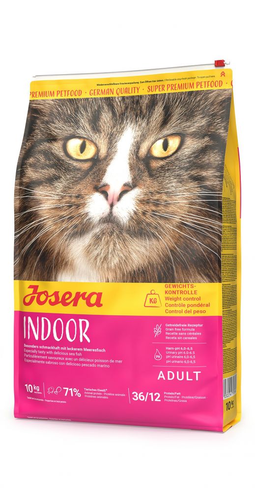 Indoor-Katzen oder kastrierte Katzen aufgepasst, hier kommt Euer neues LieblingsfutterJosera Indoor ist speziell auf die Bedürfnisse von Stubentigern und kastrierten Katzen zugeschnitten, die es lieber gemütlich mögen. Spezielle diätetische Fasern fördern das Sättigungsgefühl und ein angepasster Fett- und Proteingehalt regen den Stoffwechsel an. Das hilft Deiner Katze dabei, ein gesundes Gewicht zu halten. Perfekt für gemütliche Samtpfoten. Die getreidefreie Rezeptur des Katzenfutters begeistert mit unwiderstehlichem Meeresfisch. Der bringt außerdem wertvolle Omega-3 Fettsäuren mit. Der Anti-Haarballen-Effekt hilft beim haarigen Dilemma. Und es kann noch mehr: Die ausgewählten Zutaten sorgen für ein optimales Calcium-Phosphor-Verhältnis und Mineralstoffgehalt. Ein pH-Wert von 6,0 - 6,5 wird so gefördert und kann der Harnsteinbildung entgegenwirken. Bereit für Indoor-Abenteuer? Dann ran an den Napf! Zusammensetzung:getrocknetes Geflügelprotein; getrocknete Süßkartoffel; Erbsenmehl; Geflügelfett; Kartoffeleiweiß; Rübenfaser; getrocknetes Fischprotein aus Meeresfischen 4,0 %; hydrolysiertes tierisches Protein; Pflanzenfaser; Hefe; Mineralstoffe; gemahlene Chicorée-Wurzel (natürliche Quelle von Inulin).Analytische Bestandteile je kg:Protein 36,0 %; Fettgehalt 12,0 %; Rohfaser 4,7 %; Rohasche 7,0 %; Calcium 1,35 %; Phosphor 0,95 %; Magnesium 0,09 %; Taurin 1.600 mg.ZusatzstoffeErnährungsphysiologische Zusatzstoffe je kg:24.000 I.E. Vitamin A; 1.800 I.E. Vitamin D3; 220 mg Vitamin E; 15 mg Vitamin B1; 20 mg Vitamin B2; 20 mg Vitamin B6; 100 mcg Vitamin B12; 50 mg Calcium-D-Pantothenat; 90 mg Niacinamid; 5 mg Folsäure; 1.000 mcg Biotin; 200 mg L-Carnitin; 120 mg Eisen (Eisen(II)-sulfat-Monohydrat); 100 mg Zink (Glycin-Zinkchelat-Hydrat (fest)); 10,00 mg Mangan (Mangan(II)-oxid); 10,00 mg Kupfer (Kupfer(II)-Glycinchelat-Hydrat (fest)); 1,60 mg Jod (Kalziumjodat, wasserfrei); 0,10 mg Selen (Natriumselenit).Technologische Zusatzstoffe:Antioxidationsmittel: tocopherolhaltige Extrakte natürlichen Ursprungs.Fütterungsempfehlung:Gewicht der Katze / Futtermenge pro Tag2 - 3kg / 35 - 60g 3 - 4kg / 45 - 70g 4 - 5kg / 55 - 80g 5 - 7kg / 60 - 100g 7 - 10kg / 75 - 130g Die empfohlene Futtermenge gilt pro Tier und Tag.Bei zusätzlicher Fütterung von z.B. Snacks sollte die Futtermenge reduziert werden.Bieten Sie Ihrer Katze immer frisches Trinkwasser an.Inverkehrbringer: foodforplanet GmbH & Co. KG, Industriegebiet Süd, 63924 Kleinheubach, Tel.: 09371/940950, E-Mail: kundenbetreuung@josera.de