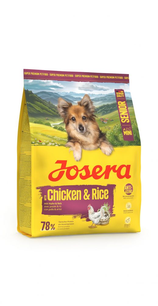 Anti-Aging-Effekt aus dem Napf? Mit Josera Mini Senior Chicken & Rice fütterst Du Deinem älteren Vierbeiner auf kleinen Pfoten genau das!Das Trockenfutter für ältere Hunde bringt eine glutenfreie Rezeptur mit, die optimal auf die Bedürfnisse von Senioren zugeschnitten ist: Wertvolle Antioxidantien wie Vitamin E, Vitamin C und Taurin helfen der Zellalterung entgegenzuwirken, während L-Carnitin hilft, altersbedingtem Muskelabbau vorzubeugen. Der reduzierte Gehalt an Phosphor kann zudem die Niereentlasten.Lachsöl liefert wertvolle Omega-3-Fettsäuren wie DHA und EPA. Diese spielen durch ihre entzündungshemmende Wirkung eine wichtige Rolle im Körper Deines Hundes, u. a. für das Immunsystem, die Haut und das Herz. Ein moderater Energie- und Mineralstoffgehalt ist perfekt auf die Aktivität älterer Vierbeiner zugeschnitten und kann die Organe im Alter zusätzlich entlasten.Dank leckerem Huhn & Reis schmeckt das glutenfreie Hundefutter auch noch superlecker – und ist in kleiner Krokettenform schnell im Mäulchen verschwunden. Guten Appetit!- Senior Hundefutter mit glutenfreier Rezeptur für kleine, ausgewachsene Hunde- Kleine, knusprige Kroketten für kleine Rassen- Hundefutter mit Huhn & Reis- Mit 78 % tierischem Protein am Gesamtprotein- Wertvolle Antioxidantien wie Vitamin E, Vitamin C und Taurin können der Zellalterung entgegen wirken- L-Carnitin hilft, altersbedingtem Muskelabbau vorzubeugen, reduzierter Gehalt an Phosphor kann dieNiere entlasten- Lachsöl liefert die wertvollen Omega-3-Fettsäuren DHA und EPAZusammensetzung:Vollkornmais; Rübenfaser; hydrolysiertes Geflügelprotein; Geflügelfett; Mineralstoffe; Reis 25 %; Lachsöl 0,5 %; gemahlene Chicorée-Wurzel (natürliche Quelle von Inulin); getrocknetes Protein der neuseeländischen Grünlippmuschel (Perna canaliculus); getrocknetes Geflügelprotein 25,0 % (davon Huhn 40,0 %).Analytische Bestandteile:Protein 24,0 %, Fettgehalt 12,0 %, Rohfaser 2,2 %, Rohasche 6,0 %, Calcium 0,95 %, Phosphor 0,70 %, Natrium 0,50 %, Taurin 1.000 mg, Magnesium 0,08 %, metabolisierbare Energie pro kg 15,5 MJ, metabolisierbare Energie pro kg 3.703 kcal.ZusatzstoffeErnährungsphysiologische Zusatzstoffe je kg:Vitamin A 24.000 I.E., Vitamin D3 1.800 I.E., Vitamin E 220 mg, Vitamin C (als Ascorbylmonophosphat,Calcium-Natrium-Salz) 200 mg, Vitamin B1 15 mg, Vitamin B2 20 mg, Vitamin B6 20 mg, Vitamin B12 100 mcg, Niacinamid 90 mg, Folsäure 5 mg, Biotin 1.000 mcg, L-Carnitin 300 mg, Eisen (Eisen(II)-sulfat-Monohydrat) 90 mg, Zink (Glycin-Zinkchelat-Hydrat (fest)) 100 mg, Mangan (Mangan(II)-oxid) 7,00 mg, Kupfer (Kupfer(II)-Glycinchelat-Hydrat (fest)) 10,00 mg, Jod (Kalziumjodat, wasserfrei) 1,15 mg, Selen (Natriumselenit) 0,10 mg, Calcium-D-Pantothenat 50 mg.Technologische Zusatzstoffe:Antioxidationsmittel: tocopherolhaltige Extrakte natürlichen Ursprungs.Fütterungsempfehlung:Gewicht = Aktivität / Tag bis 1 Std. = Aktivität / Tag bis 3 Std.02 kg = 045 g = 050 g04 kg = 075 g = 085 g06 kg = 100 g = 115 g08 kg = 120 g = 140 g10 kg = 145 g = 165 gDie empfohlene Futtermenge gilt pro Tier und Tag. Bei zusätzlicherFütterung von z.B Snacks sollte die Futtermenge reduziert werden.Bieten Sie ihrem Tier immer frisches Trinkwasser an.Alleinfuttermittel für ausgewachsene Hunde.Inverkehrbringer: foodforplanet GmbH & Co. KG, Industriegebiet Süd, 63924 Kleinheubach, Tel.: 09371/940950, E-Mail: kundenbetreuung@josera.de