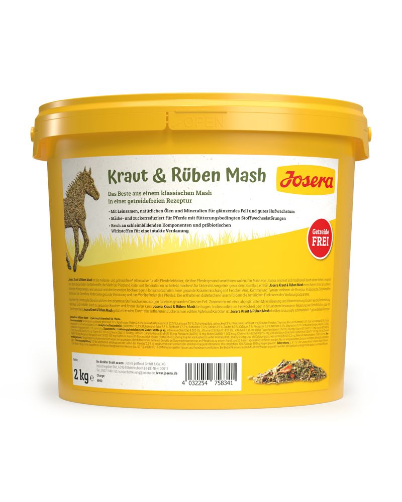 JOSERA Kraut & Rüben Mash ist die getreidefreie* Alternative für alle Pferdeliebhaber, die ihre Pferde gesund verwöhnen wollen. Ein Mash von JOSERA zeichnet sich traditionell durch einen hohen Leinanteil aus, denn dieser liefert die Nährstoffe, die Mash bei Pferd und Reiter seit Generationen so beliebt machen! Zur Unterstützung einer gesunden Darmflora enthält JOSERA Kraut & Rüben Mash einen hohen Anteil an schleimbildenden Komponenten,wie Leinsaat und den besonders hochwertigen Flohsamenschalen. Eine gesunde Kräutermischung mit Fenchel, Anis, Kümmel und Tymian verfeinert die Rezeptur. Präbiotische Zichorienpülpe verbessert die Darmflora, fördert eine gesunde Verdauung und das Wohlbefinden des Pferdes. Die enthaltenen diätetischen Fasern fördern die natürlichen Funktionen des Verdauungsapparates. Hochwertige, essentielle Öle unterstützen den gesamten Stoffwechsel und sorgen für einen gesunden Glanz im Fell. Zusammen mit einer abgestimmten Mineralisierung und Vitaminisierung fördern sie die Verbesserung des Haut- und Fellbilds. Auch zu gesunden Knochen und festen Hufen kann JOSERA Kraut & Rüben Mash beitragen. Insbesondere im Fellwechsel oder in Situationen besonderer Belastung wie Rehabilitation oder im Turniersport kann JOSERA Kraut & Rüben Mash gefüttert werden. Durch den enthaltenen zuckerarmen echten Apfel und Karotten ist JOSERA Kraut & Rüben Mash darüber hinaus sehr schmackhaft. Es eignet sich daher hervorragend z.B. zur Verabreichung von unangenehm schmeckenden Medikamenten. JOSERA Kraut & Rüben Mash steht ganz in der Tradition des beliebten „Kraut & Rüben“ Sortiments: Natürliche getreidefreie Rezepturen, ausgestattet mit hochwertiger Rohfaser und gesunden Wiesenkräutern.Das schmeckt! JOSERA Kraut & Rüben Mash muss nicht mehr gekocht werden, sondern kann bereits nach 15 bis 20 Minuten Einweichzeit in warmem Wasser gefüttert werden. Bei Bedarf kann es auch mit kaltem Wasser angerührt werden, die Quellzeit verlängert sich dadurch um etwa 5 Minuten.*getreidefreie Rezeptur - Reich an schleimbildenden Komponenten, diätetischen Fasern und präbiotischen Wirkstoffen für eine intakte Verdauung. - Getreidefrei sowie stärke- und zuckerreduziert für Pferde mit fütterungsbedingten Stoffwechselstörungen. - Hoher Anteil an Leinsamen, natürlichen Ölen und Mineralien für glänzendes Fell und gesundes Hufwachstum.Zusammensetzung:Wiesengräser, schonend getrocknet 35,0 %; Apfeltrester Flakes 23,3 %; Lein-Extraktionsschrot 22,5 %; Leinsaat 10,0 %; Zichorienpülpe, getrocknet 3,0 %; Rapsöl raffiniert 2,0 %; Flohsamenschalen 0,5 %;Kräuter (Fenchel, Thymian, Anis und Kümmel) 1,5 %; Calciumcarbonat 0,7 %; Karottenflocken 0,5 %.Fütterungsempfehlung:2-3 Mal wöchentlich abhängig von der Größe des Pferdes 0,5-1 kg JOSERA Kraut & Rüben Mash ergänzend oder anstatt der üblichen Krippenfutterration. Wir empfehlen 100-150g je 100 kg Körpergewicht.Zubereitung: z. B. 1-2 Liter Josera Kraut & Rüben Mash (Hinweis: 1 Liter Mash = 450 g) mit der doppelten bis dreifachen Menge warmen Wasser (ca. 50 °C) anrühren, 15-20 Minuten quellen lassen und handwarm verfüttern. Bei Bedarf kann es auch mit kaltem Wasser angerührt werden, die Quellzeit verlängert sich dadurch um etwa 5 Minuten.Inverkehrbringer: foodforplanet GmbH & Co. KG, Industriegebiet Süd, 63924 Kleinheubach, Tel.: 09371/940950, E-Mail: kundenbetreuung@josera.de