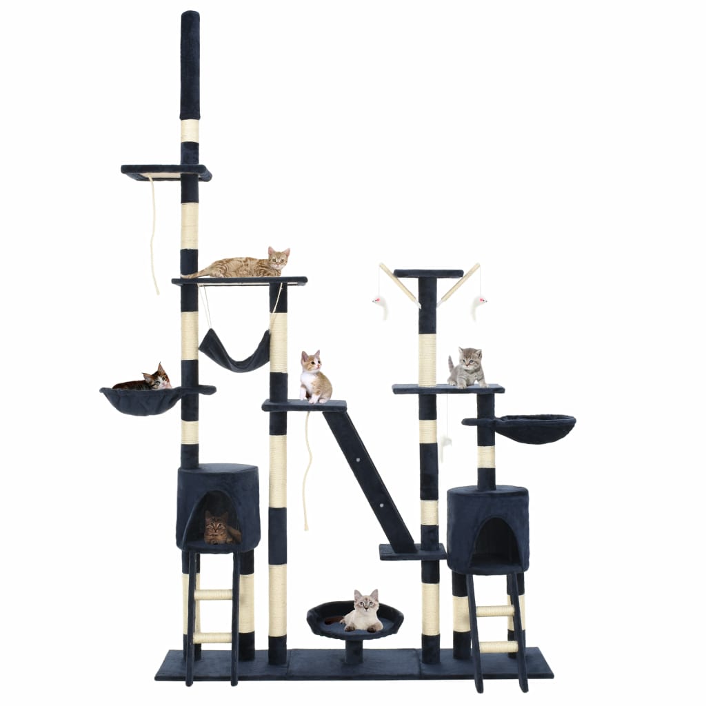 Verwöhnen Sie Ihre schnurrenden Freunde mit einem Hauch von Luxus - mit unserem Katzen-Kratzbaum! Dieser mehrstöckige Katzen-Spielplatz mit einem soliden, plüschbezogenen Rahmen ist der perfekte Rückzugsort für Ihre Katzen zum Krallenschärfen, Klettern, Verstecken und Ausruhen. Ihre Stubentiger können ihre Krallen an den Kratzsäulen schärfen, die mit Sisalseil umwickelt sind, was ihre Kratzinstinkte auf gesunde Weise befriedigen. Ebenfalls werden es die Katzen genießen, einander hinterherzujagen, während sie diesen lustigen Spielplatz hoch- und runterspringen. Nachdem sie genug Spielspaß haben, werden Ihre kleinen vierbeinigen Freunde es lieben, sich auf den oberen Plattformen auszuruhen, wo sie eine bessere Aussicht haben. Sie können sich auch in den gemütlichen Häusern verstecken, um ein Nickerchen zu machen oder sich in den bequemen Körben oder der Hängematte entspannen. Mit all seinen lustigen Funktionen wird dieses Katzen-Spielhaus schnell zum Lieblingsplatz Ihrer Stubentiger! Der Kratzbaum ist leicht zu montieren.