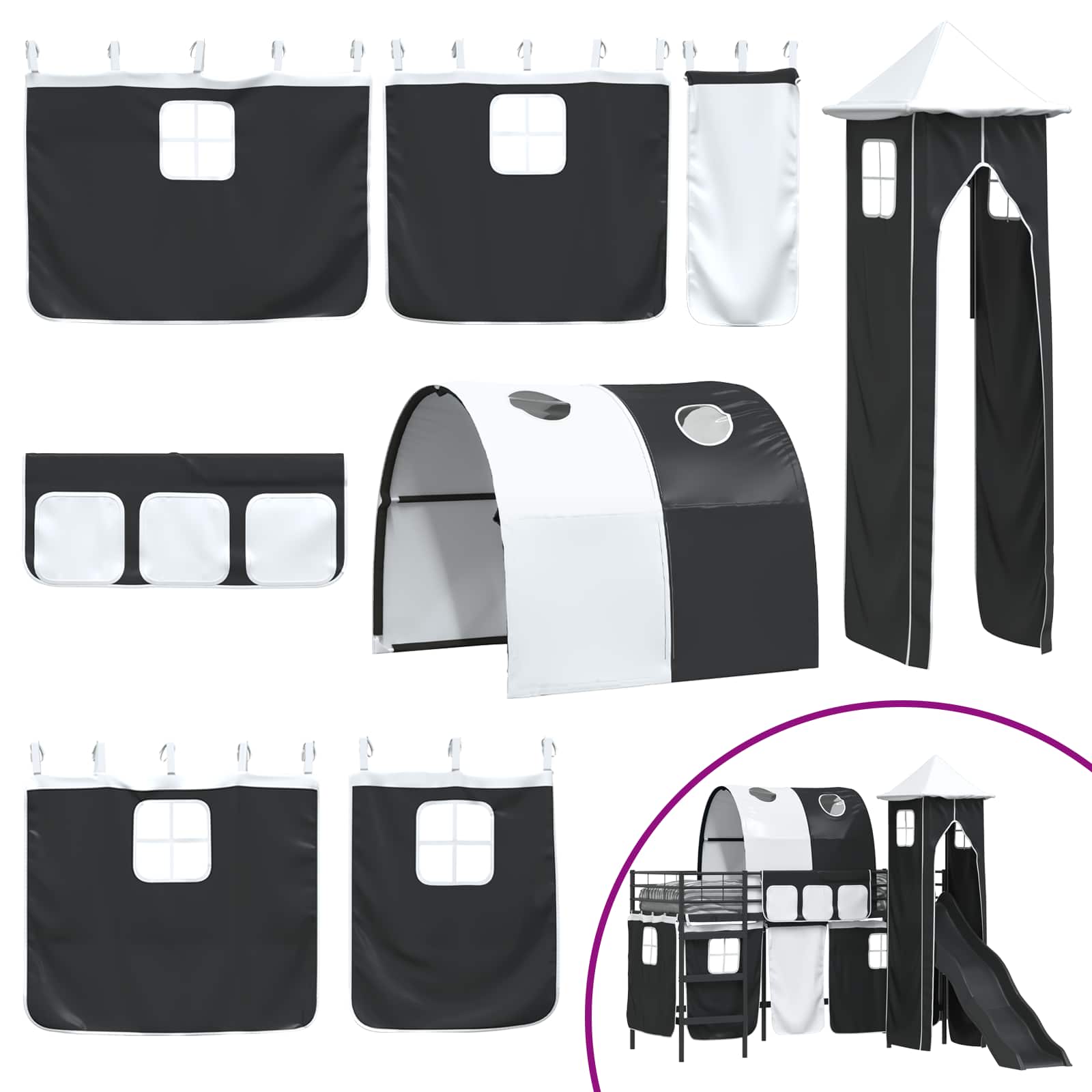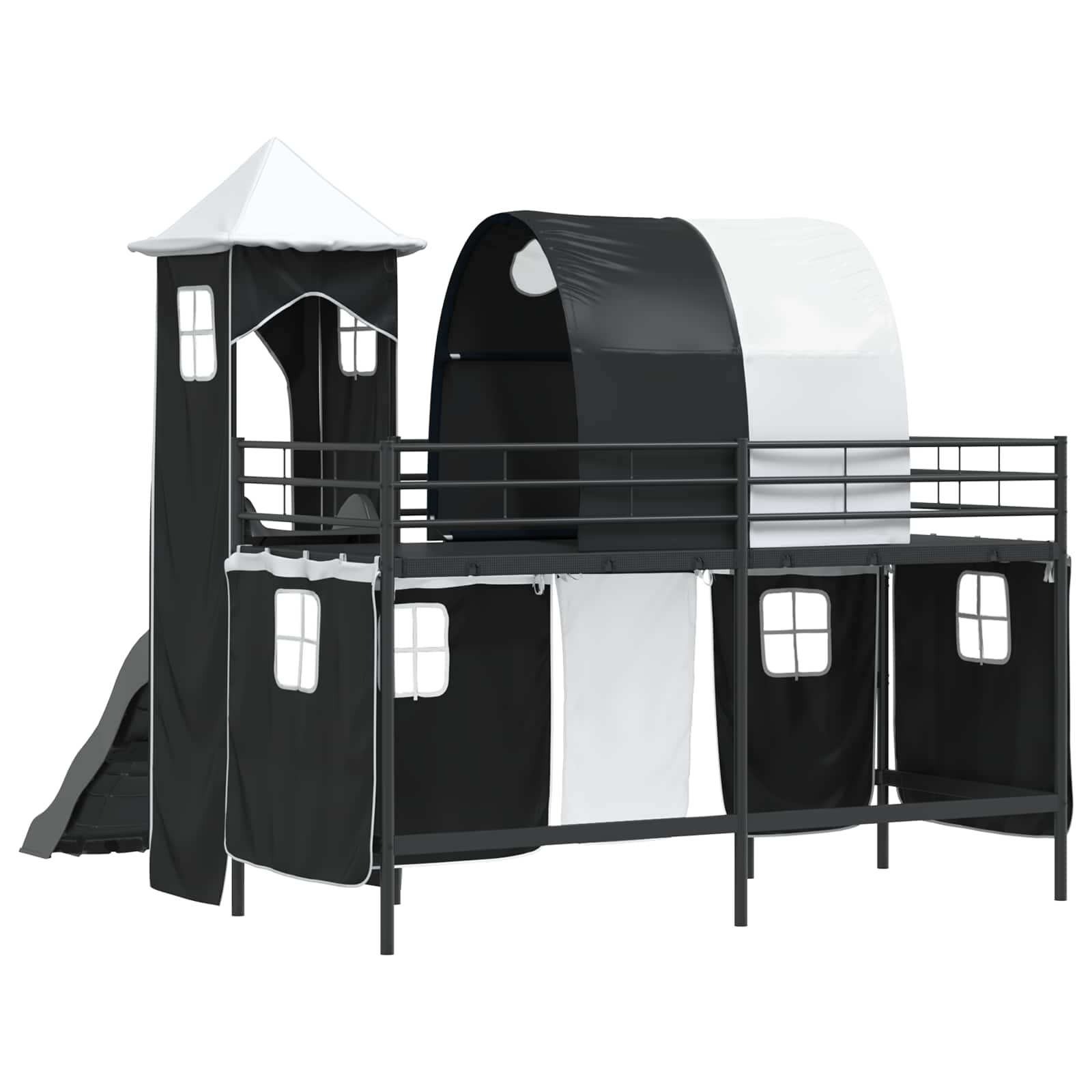 Dieser moderne Hochbett-Rahmen ist der perfekte Rückzugsort zum Entspannen und Spielen. Mit durchdachten Details wie Vorhängen, einem Torbogen, einer Rutsche und einem Turm lädt er zu endlosem Spaß ein. Das Loft-Bett verleiht jedem Kinderzimmer einen stylischen Touch und verwandelt es in einen flexiblen Raum zum Schlafen und Spielen. So wird das Zimmer deines Kindes sowohl entspannt als auch kreativ gestaltet, mit einem robusten, mattschwarzen Metallrahmen, der Langlebigkeit garantiert. Die hübschen blauen und schwarzen Vorhänge setzen einen schönen Akzent und bieten gleichzeitig Privatsphäre. Stabiler Metallrahmen macht das Hochbett sicher und sorgt für ein gutes Gefühl. Die Quadratbeine und der Lattenrost bieten festen Halt für die Matratze und sehen dabei schick aus. Einladende Spielelemente verwandeln dieses Hochbett in einen spannenden Rückzugsort für Kinder. Die Rutsche sorgt für viel Spaß, während der Bogen und der Turm noch mehr Abenteuer bringen. Ein tolles Design, das die Kreativität deines Kindes anregt. Gemütlicher Schlafbereich mit der mittelfesten Multizonen-Memory-Schaummatratze, die sich perfekt dem Körper deines Kindes anpasst und in allen Schlaflagen guten Halt bietet. Diese geniale Zusammenstellung sorgt für erholsamen Schlaf, der wichtig für dein wachsendes Kind ist. Stylische Vorhänge sind einfach mit einem Ösensystem zu bedienen und bieten Privatsphäre, wenn es gewünscht ist. Die farblich abgestimmten Netzvorhänge fügen sich super in jede Kinderzimmer-Dekoration ein. Pflegeleichte Anleitung gibt einfache Tipps zur Reinigung deines Bettes. Du brauchst nur ein paar Werkzeuge wie einen Schraubenschlüssel, ein Maßband und einen Schraubendreher für den Aufbau. Die Pflege ist auch ganz einfach mit einem feuchten Tuch ? scharfe Chemikalien solltest du lieber vermeiden. Unsere benutzerfreundlichen Anleitungen helfen, dass dieses vielseitige Bett lange hält.