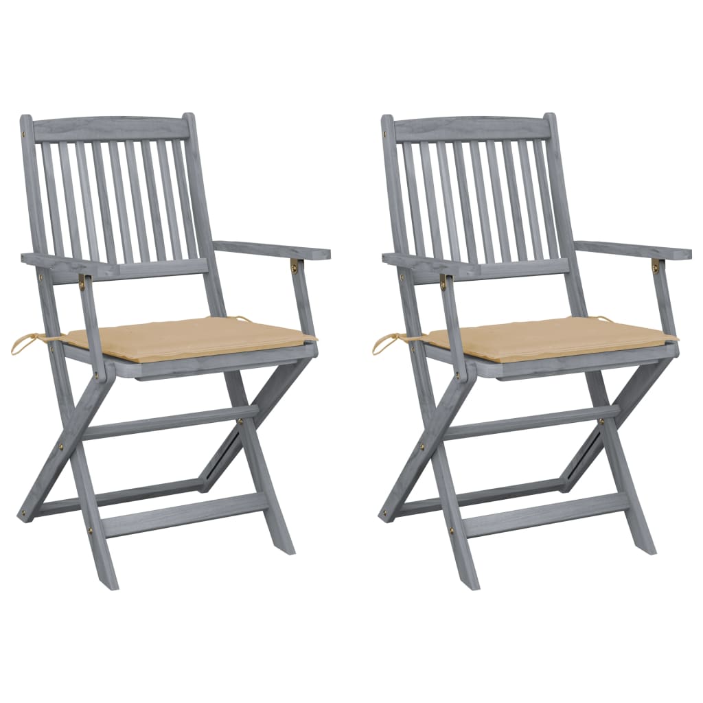 Dieses moderne Set aus Holz-Gartenstühlen mit Sitzpolstern verleiht Ihrem Garten, Ihrer Terrasse oder Ihrem Hof einen Hauch von natürlichem Stil und ist außerdem eine ausgezeichnete Wahl für Mahlzeiten im Freien. Diese Essstühle bestehen aus massivem Akazienholz, einem tropischen Hartholz, was die Stühle witterungsbeständig macht und eine jahrelange Lebensdauer gewährleistet, da massives Akazienholz sowohl belastbar als auch verschleißfest ist. Die grau lasierte Oberfläche ist ganz einfach mit einem feuchten Tuch zu reinigen. Bei Nichtgebrauch lassen sich die Stühle platzsparend zusammenklappen. Darüber hinaus bieten die mitgelieferten Sitzkissen zusätzlichen Komfort beim Entspannen oder Speisen. Zur sicheren Befestigung am Stuhl ist jedes Sitzpolster mit je zwei Bindebändern an zwei Ecken versehen.
