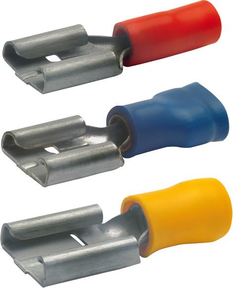 Für fein- und feinstdrähtige Leiter. Isoliert, halogenfrei. Querschnittabhängige Farbkodierung. Temperaturbeständigkeit bei 70° C. Verzinnt. Werkstoff CuZn (Messing). Isolierhülse: PVC.