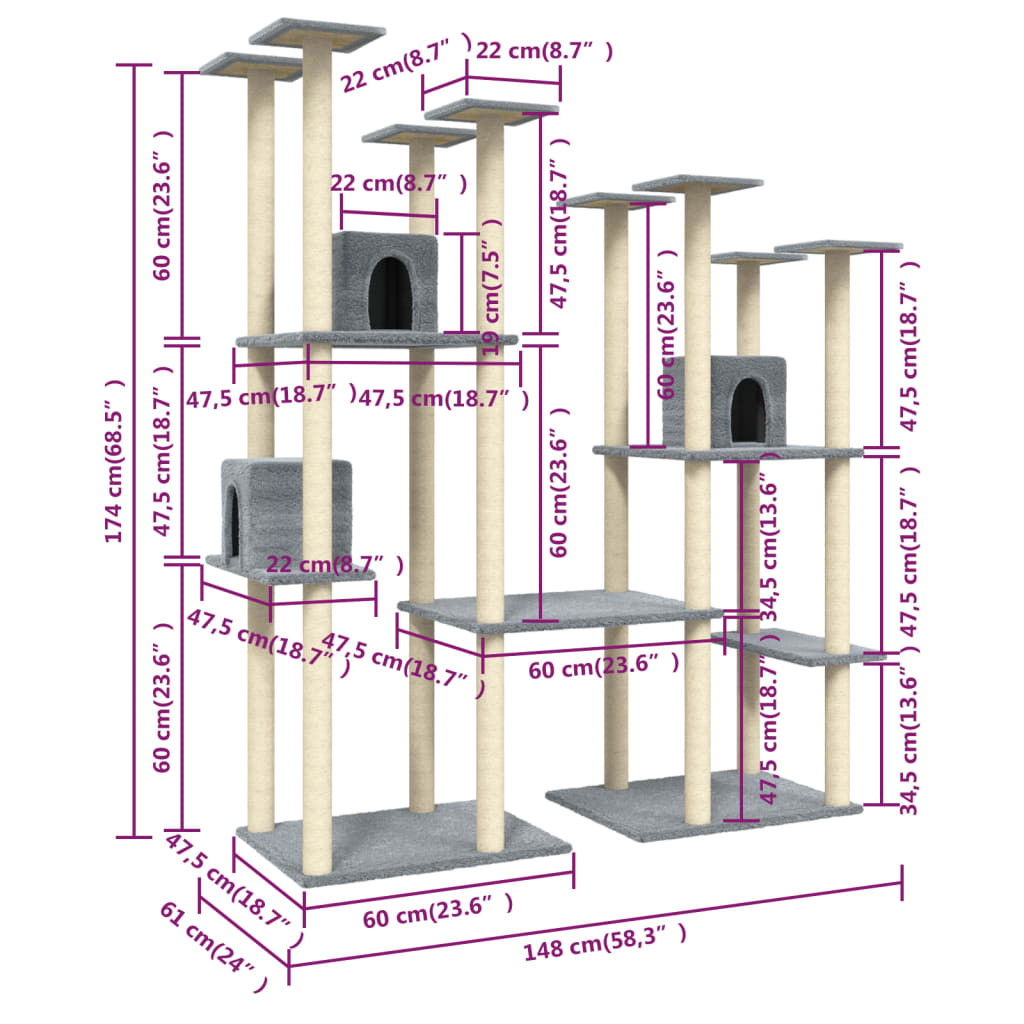 Dieser Kratzbaum ist der perfekte Rückzugsort für Ihre Katzen zum Kratzen, Klettern, Sitzen, Verstecken und Ausruhen. Er gibt Ihren Katzen die Möglichkeit, sich zu strecken und zu bewegen, besonders in den kalten Wintermonaten, wenn sie im Haus sind. Sisal-Pfosten: Die widerstandsfähigen und starken natürlichen Sisalpfosten sind perfekt für Ihre geliebten Katzen, um ihren Kratzinstinkt zu befriedigen und zu verhindern, dass sie an Ihren Möbeln kratzen.Vielfältige Verwendung: Die Kleinen werden sich freuen, wenn sie sich gegenseitig hinterherjagen, während sie in diesem lustigen Spielcenter auf und ab hüpfen. Wenn sie genug gespielt haben, werden Ihre kleinen Freunde es lieben, sich auf den oberen Plattformen auszuruhen, wo sie eine bessere Aussicht haben.Komfortables Haus: Das Haus ermöglicht es Ihrer Katze, ohne Unterbrechungen zu ruhen und zu schlafen.