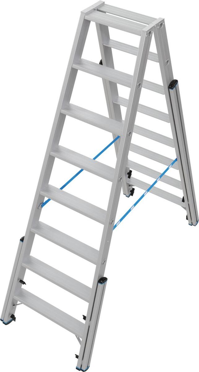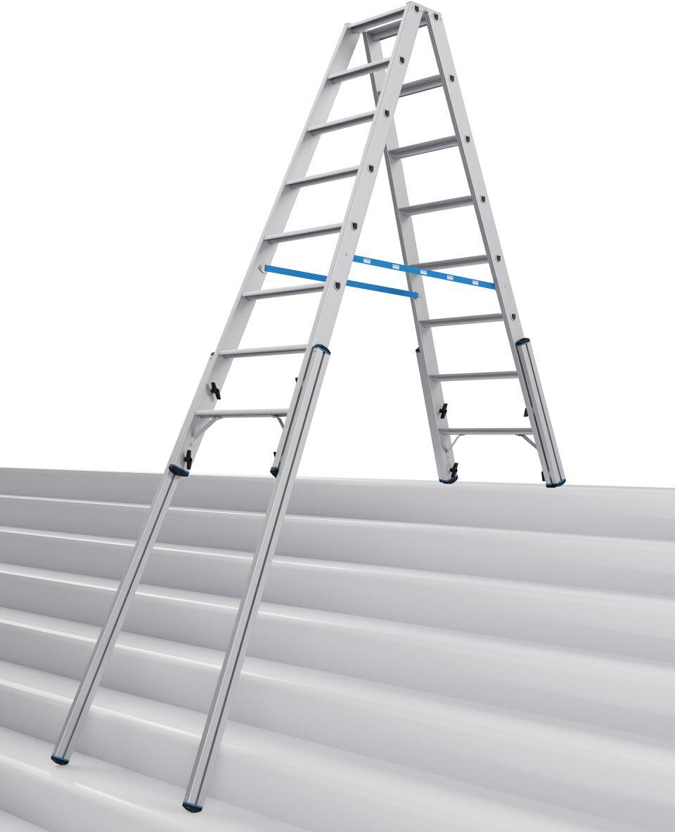 Entwickelt für professionelle Einsatzzwecke, bietet diese Aluminium-Teleskop-Doppelleiter mit Treppenfunktion hohe Standsicherheit, auch im Einsatz auf Treppen, Absätzen, Podesten und ähnlichen Höhenunterschieden. Die vier stufenlos verstellbaren Holmverlängerungen mit stabiler Schiebeführung ermöglichen den Einsatz auf unebenen Flächen. Die eloxierten Holmverlängerungen sorgen für eine leichtgängige Bedienung, während der außenliegende Schiebemechanismus mit einem stufenlosen Verstellbereich von bis zu 1.110 mm am Stützteil größtmögliche Flexibilität bietet. Verschraubte hochfeste Aluminium-Gelenke und wetterfeste, verschraubte Gurtbänder in Metalllaschen gewährleisten eine robuste und langlebige Konstruktion. Die profilierten, verstärkten D-Stufen mit einer Tiefe von 80 mm bieten einen sicheren Aufstieg und bequemen Stand, wobei sie die Anforderungen der TRBS 2121-2 für die Nutzung von Stufen als Arbeitsplatz erfüllen. Der bündige Holm-/Stufenabschluss verhindert Kantenbildung und sorgt für zusätzlichen Komfort.