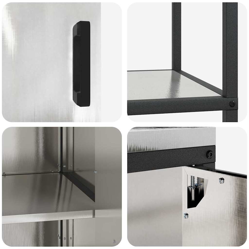 Dieser Küchenschrank dreht sich voll und ganz um tollen Stauraum für moderne Küchen. Mit seinem rechteckigen, opaken Look bringt er einen schicken, funktionalen Flair in jede Umgebung ? sei es deine Küche oder die Garage. Er hilft dabei, deine Küchenutensilien ordentlich und schick zu präsentieren. Stark genug für den Einsatz zu Hause oder im Gewerbe, verbindet er Praktikabilität mit Stil. Robuste Konstruktion: Der Schrank kann schwere Sachen tragen, dank des stabilen Rahmens aus pulverbeschichtetem Stahl. Er ist auf Langlebigkeit ausgelegt, ideal für Haus- und Profiküchen, und hält deine Küchengeräte sicher. Verstellbare Füße: Dank der Fußnivelierer passt sich dieser Lagerschrank leicht an unebene Böden an. Das erhöht die Stabilität und Sicherheit. Dieses clevere Feature sorgt dafür, dass deine Sachen stabil und sicher bleiben, egal was kommt. Robuste Stahlregale: Der Schrank hat starke Stahlregale, die sich hervorragend für schweres Küchenequipment eignen. Diese Regale sind verschleißfest und bieten die nötige Unterstützung für all deine Lagerbedürfnisse. Zudem sind sie leicht zu reinigen und bleiben langfristig in gutem Zustand. Praktisches Design: Die pulverbeschichteten Scharniertüren sind mit leicht zu greifenden D-Griffen ausgestattet. Sie öffnen sanft und schließen sicher, sodass du easy an deine Sachen rankommst. Die pulverbeschichtete Oberfläche macht nicht nur die Türen haltbarer, sondern sieht auch stylisch aus, was den Schrank zu einer tollen Ergänzung für deine Küche macht. Pflegehinweise: Um den Schrank in Topform zu halten, vermeide scharfe Chemikalien und Scheuermittel, die die Oberfläche beschädigen könnten. Wenn du ihn nicht draußen nutzt, wirf eine Abdeckung darüber, damit die Außenseite in gutem Zustand bleibt. Diese Tipps helfen dem Schrank, lange ein wichtiger Teil deiner Küchenlagerung zu sein.