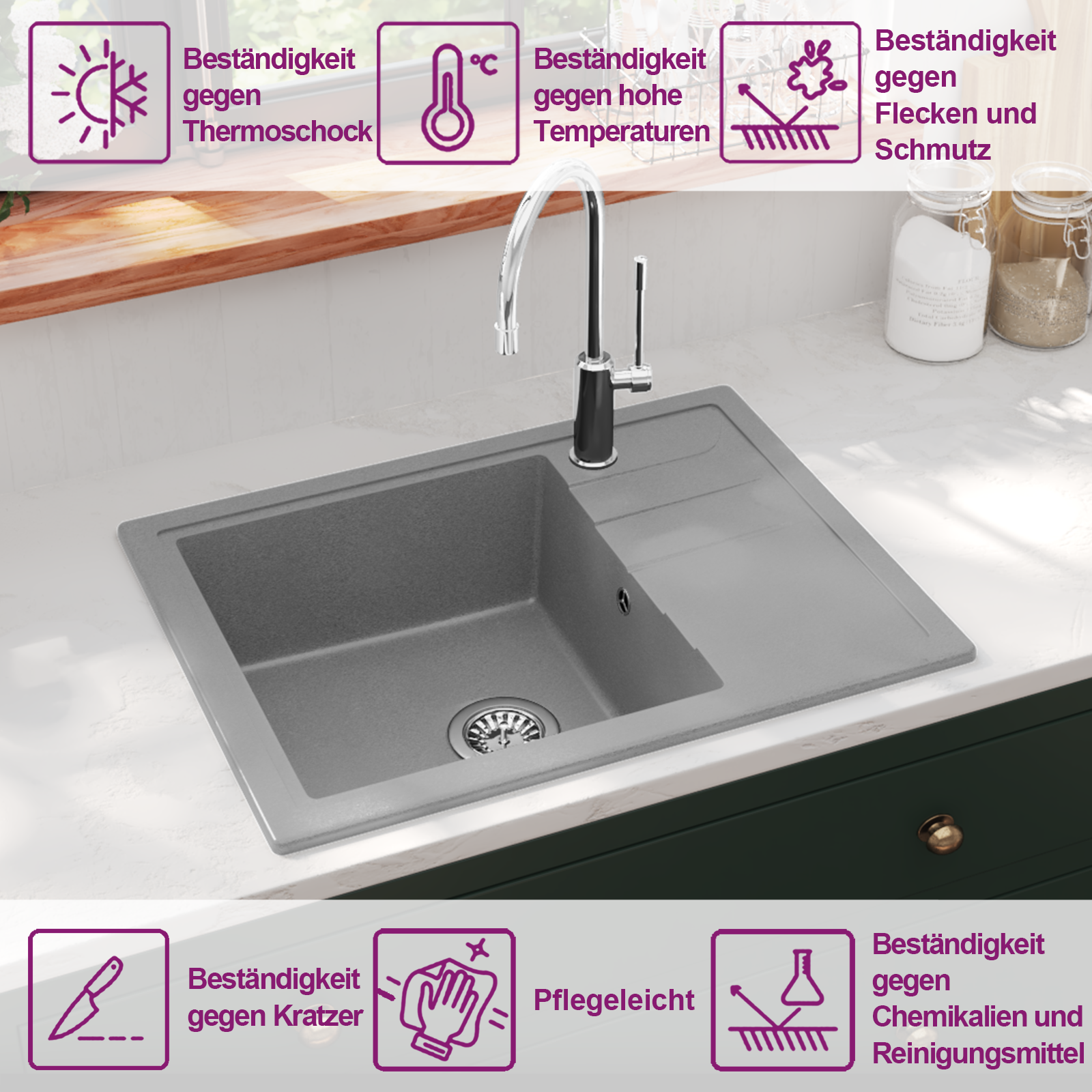 Dieses Granit-Spülbecken ist eine zeitlose Ergänzung zu Ihrem vorhandenen Küchendekor. Es verfügt über ein einzelnes, extra tiefes Becken und ein schlankes Design. Das Waschbecken besteht aus Granit und ist hitzebeständig, kratz- und schlagfest sowie leicht zu reinigen. Die seitliche Abtropffläche bietet Ihnen zusätzlichen Platz für Ihr Geschirr. Da die Spüle vollständig umkehrbar ist, kann sie entweder links oder rechts vom Becken angebracht werden. Ein Abflussfilter ist im Lieferumfang enthalten, damit Überreste einfach entfernt werden können. Das Abflussloch hat einen Durchmesser von 90 mm. Dieses Spülbecken eignet sich für die Montage über oder unter der Arbeitsplatte.