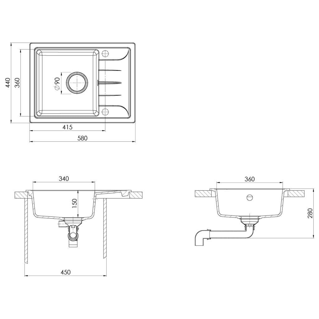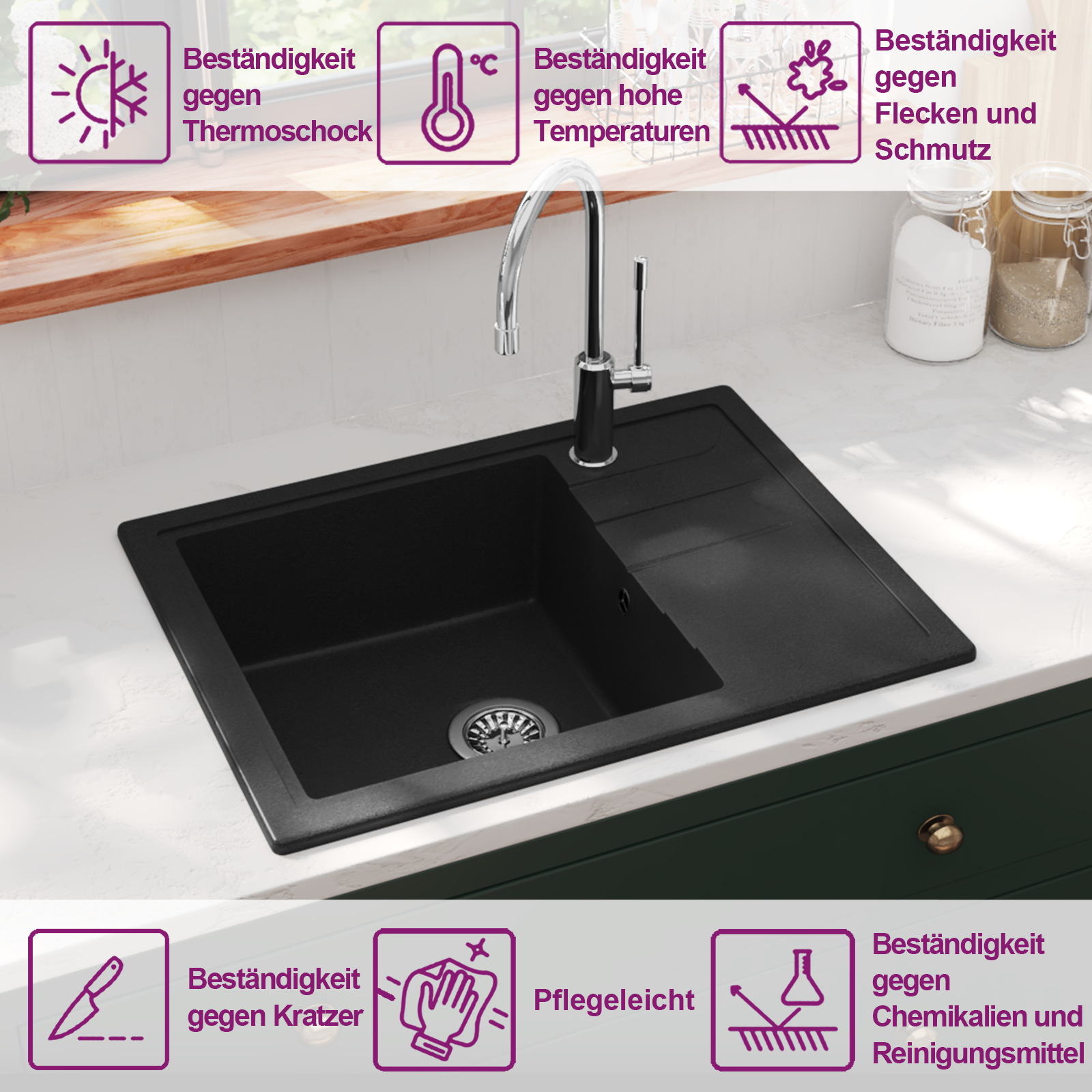 Dieses Granit-Spülbecken ist eine zeitlose Ergänzung zu Ihrem vorhandenen Küchendekor. Es verfügt über ein einzelnes, extra tiefes Becken und ein schlankes Design. Das Waschbecken besteht aus Granit und ist hitzebeständig, kratz- und schlagfest sowie leicht zu reinigen. Die seitliche Abtropffläche bietet Ihnen zusätzlichen Platz für Ihr Geschirr. Da die Spüle vollständig umkehrbar ist, kann sie entweder links oder rechts vom Becken angebracht werden. Ein Abflussfilter ist im Lieferumfang enthalten, damit Überreste einfach entfernt werden können. Das Abflussloch hat einen Durchmesser von 90 mm. Dieses Spülbecken eignet sich für die Montage über oder unter der Arbeitsplatte.