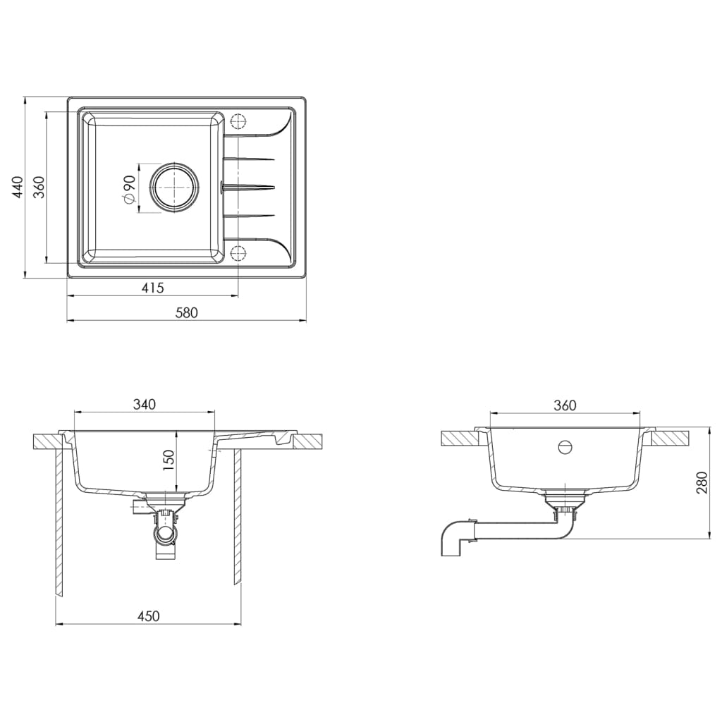 - Beckenmaße: 340 x 360 x 150 mm (B x T x H)