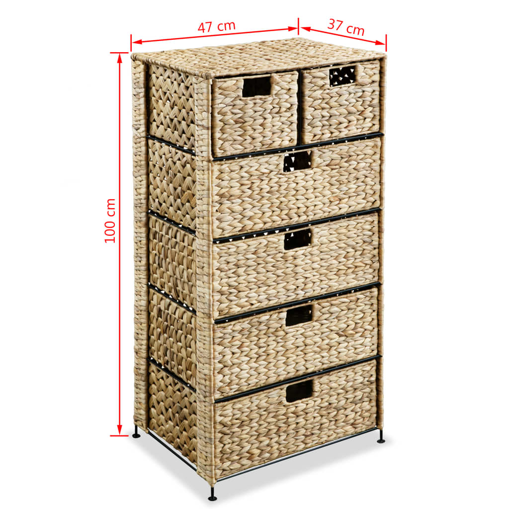 Dieser praktische Schubladenschrank bietet eine perfekte Aufbewahrungslösung und nimmt kaum Platz in Anspruch. Die 6 Schubladen bieten reichlich Stauraum für die unterschiedlichsten Sachen. Mit einem Metallgestell und Körben aus Wasserhyazinthe versehen, ist das Standregal sehr stabil und haltbar. Die optisch ansprechende Weberei trägt zum rustikalen Charme des Schranks bei.