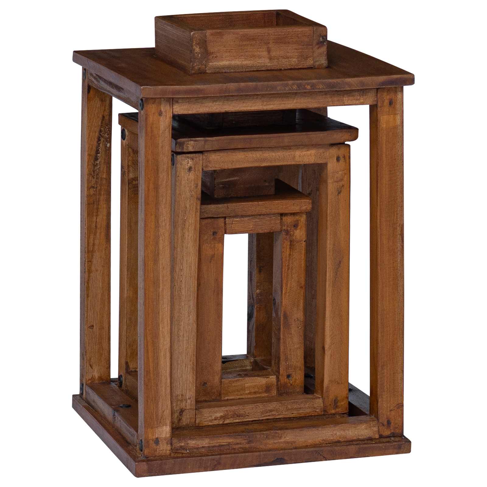 Dieses wunderschöne Laternen-Set verleiht deinem Wohnzimmer oder überdachten Außenbereichen einen Hauch von rustikaler Eleganz. Die Laternen strahlen natürliche und stattliche Schönheit aus und kombinieren Stil mit Funktionalität. Sie erzeugen eine einladende Atmosphäre mit ihrem warmen Braunton und der strukturierten Oberfläche. Massive Mahagoni-Konstruktion Diese Laternen, aus robustem Mahagoniholz gemacht, zeigen ein tolles natürliches Muster und einen warmen Braunton, der jeden Raum aufwertet. Mahagoni ist äußerst langlebig, was sicherstellt, dass sie dir lange Freude bereiten. Trio-Set für dynamische Displays Jedes Set beinhaltet drei Laternen in den Größen 30x30x44 cm, 20x20x37 cm und 14x14x28 cm. Diese Vielfalt bedeutet, dass du sie kreativ arrangieren kannst, egal ob auf einem Tisch oder verteilt im Raum für ein einladendes Licht. Rustikaler Stil Der rustikale Look der Laternen mit ihrer strukturierten Oberfläche und den natürlichen Unvollkommenheiten gibt deinem Zuhause Persönlichkeit und Charme. Perfekt für traditionelle oder eklektische Stile, machen diese Stücke den Raum warm und einladend. Für Innen- und geschützte Außenbereiche Diese Laternen sind flexibel einsetzbar und passen sowohl in Innenräume als auch in geschützte Außenbereiche. Sie bringen ein stimmungsvolles Licht ins Wohnzimmer oder auf die Veranda. Einfach zu pflegen Die Pflege dieser Laternen ist simpel ? einfach mit einem feuchten Tuch abwischen, um ihren Glanz zu erhalten. So bleiben sie über Jahre hinweg ein schöner Teil deiner Einrichtung.