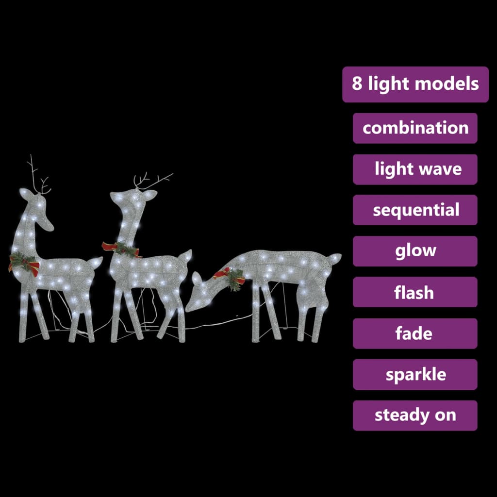Dekorieren Sie Ihr Haus mit diesem Rentier-Weihnachtsdeko. Jedes Mitglied dieser Rentier-Familie hat eine schöne rote Schleife am Hals, um eine besondere, feierliche Note zu verleihen. Langlebiges Material: Diese Rentiere aus starkem Stoff und Stahl sind absolut langlebig.Energiesparende LEDs: Jedes leuchtende Rentier verfügt über 90 LEDs, die energieeffizient und langlebig sind.Mesh-Design: Dank des Netz-Designs erzeugt diese Weihnachtsbeleuchtung einen großartigen Effekt.Verschiedene Lichteffekte: Entworfen mit 8 verschiedenen Lichteffekten: eine Kombination aus allen Effekten, langsam leuchtend, funkelnd/blinkend, wellenartig, fließend, sequentiell, kontinuierliche Beleuchtung und langsames Verblassen. Hinweis:Wenn du dieses Produkt im Freien verwendest, stelle sicher, dass der USB-Anschluss im Innenbereich in einer trockenen Umgebung angeschlossen ist.Das Produkt verfügt über einen USB-Anschluss, aber die zertifizierte 5-V-USB-Stromquelle ist nicht im Lieferumfang enthalten.