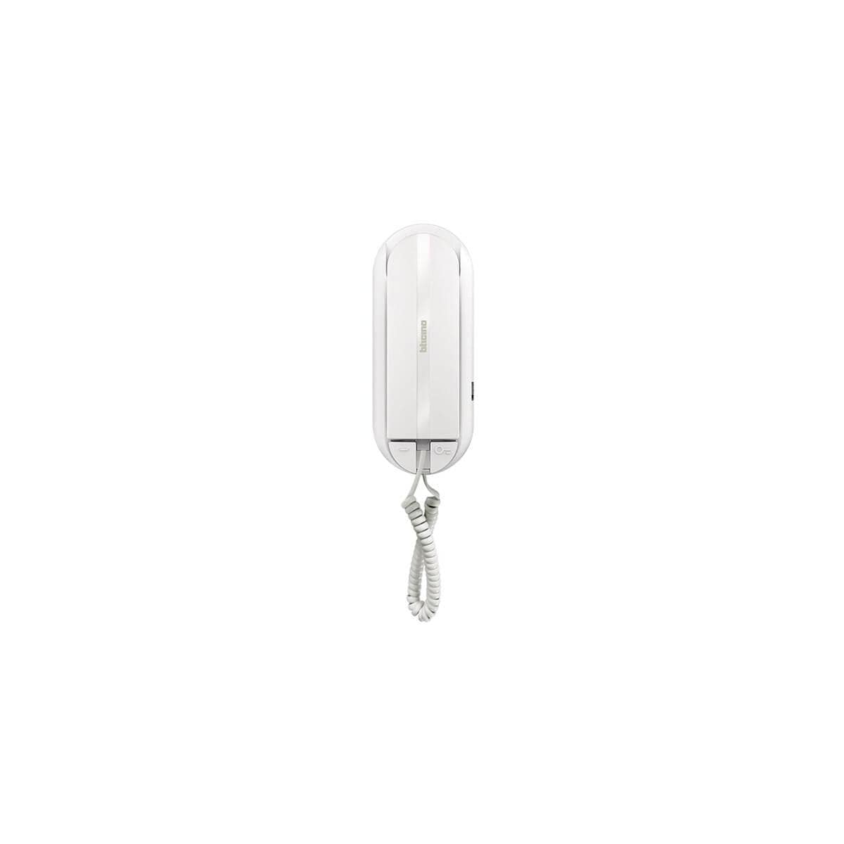 Audio-Hausstation für Bticino 2-Draht Sprechanlagen mit eingebauter Mithörsperre, elektronischer Türruf mit Rufunterscheidung für Etagenruf, mit Ruflautstärkeschalter. Gewendelte Hörerschnur mit RJ Stecker, Elektretmikrofon, 1 Türöffnertaste, 1 Lichttaste, Farbe: Weiß