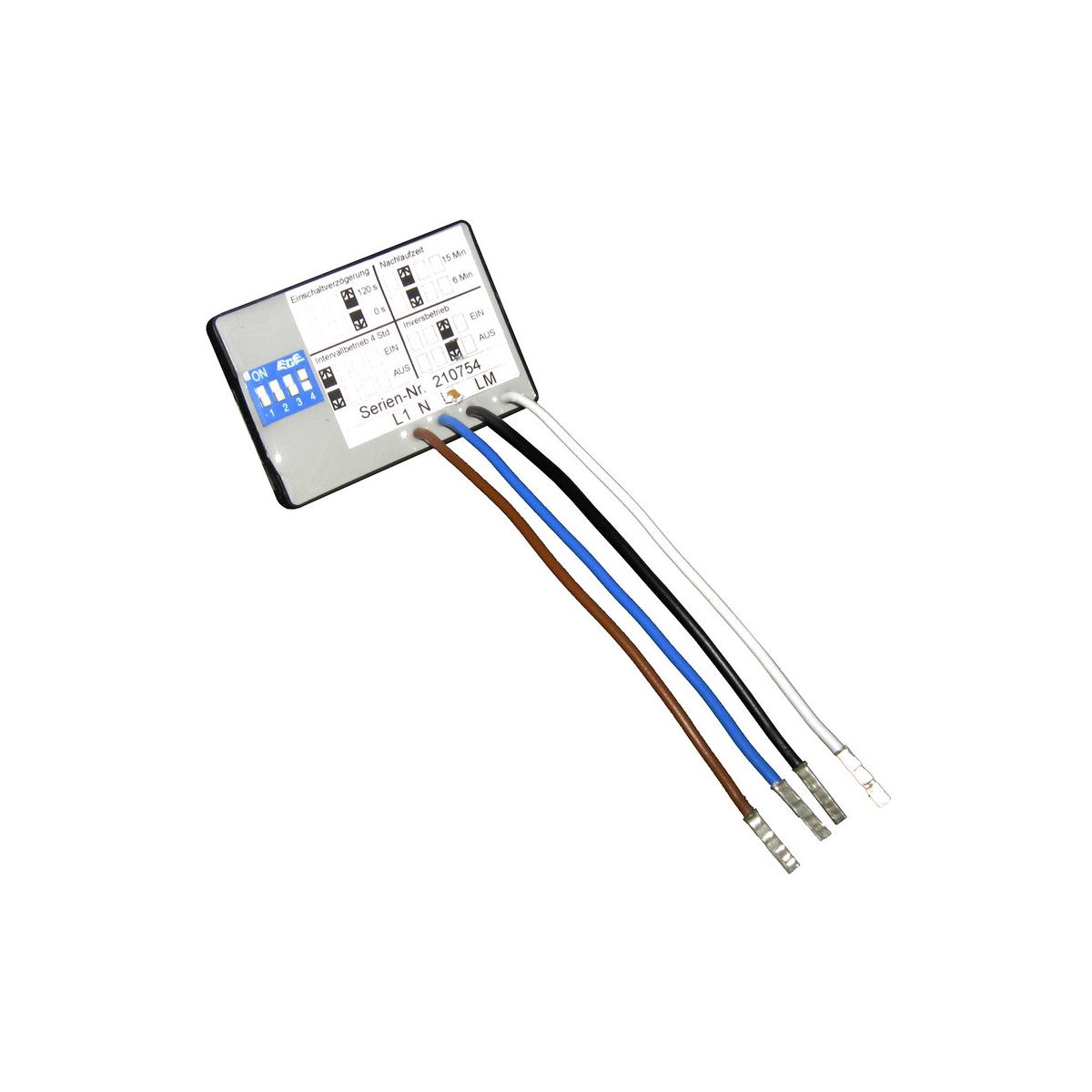 Einbau in Abzweigdosen und 60 mm tiefe Schalterdosen, für programmierbare vollautomatische Nachlaufsteuerung, Einschaltverzögerung, Inversschaltung und wählbare Intervallschaltung.