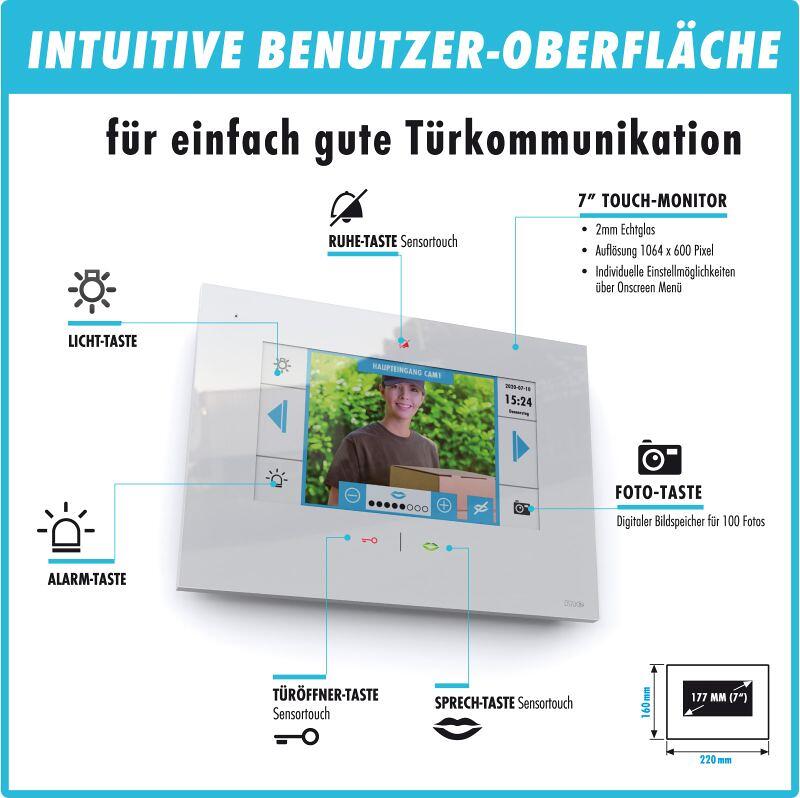 - 177mm (7") kapazitiver Touch-Monitor mit digitalem Bildspeicher für bis zu 100 Fotos mit Datum und Uhrzeit