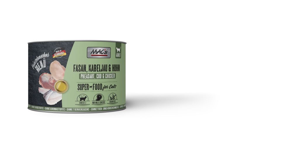 MACs Fasan, Weißfisch & Huhn wird aus erlesenen Zutaten schonend zubereitetDas Fleisch stammt ausschließlich aus deutscher Produktion. Die Kombination verschiedener Inhaltsstoffe sorgt für eine ausgewogene Mahlzeit für Ihre Katze.Zusammensetzung:70,9 % Huhn (bestehend aus Hühnerfleisch, Hühnerherzen, Hühnermuskelmägen, Hühnerlebern, Hühnerfleischbrühe), 18 % Weißfisch, 10 % Fasan, 1 % Mineralstoffe, 0,1 % Leinöl.Analytische Bestandteile:Rohprotein 10,8 %, Rohfett 5,8 %, Rohfaser 0,3 %, Rohasche 2,3 %, Feuchtigkeit 80,0%.Zusatzstoffe:Zink (Zinksulfat, Monohydrat) 25 mg, Mangan (Mangan(II)-sulfat, Monohydrat) 1,4 mg, Jod (Kalziumjodat, wasserfrei) 0,75 mg, Taurin 1.500 mg.Fütterungsempfehlung:Gewicht der Katze TagesrationIndoor Katze:3,0kg - 116-141g3,5kg - 127-156g4,0kg - 140-171g4,5kg - 151-185g5,0kg - 162-198g6,0kg - 184-224g7,0kg - 204-248g8,0kg - 222-272gAktive Katze:3,0kg - 181-222g3,5kg - 202-245g4,0kg - 221-268g4,5kg - 239-291g5,0kg - 256-312g6,0kg - 289-352g7,0kg - 320-390g8,0kg - 350-428gBei den Angaben handelt es sich um Richtwerte. Der tatsächliche Nahrungsbedarf Ihres Tieres ist individuell unterschiedlich und kann je nach Alter, Geschlecht, Rasse oder Aktivität abweichen.Alleinfutter für Katzen. Inverkehrbringer: Pro Pet Koller GmbH, Messerschmittstr. 4, 53925 Kall, Tel.: 02441/994400, Fax: 02441/99440111, E-Mail: info@propet.de