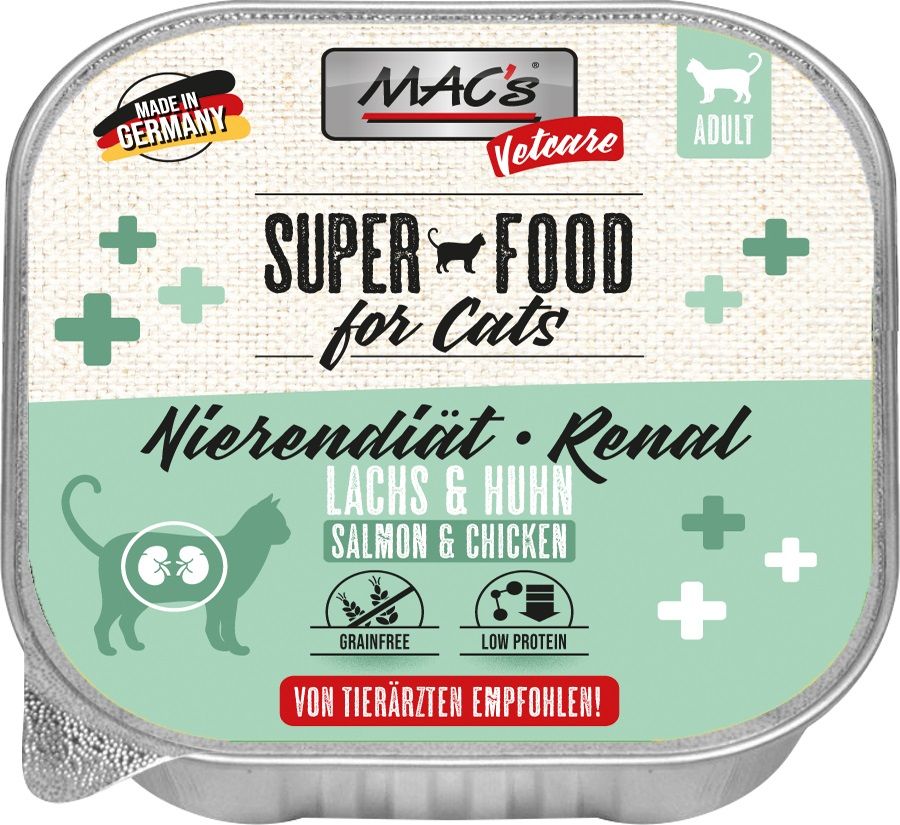 MACs Nierendiät Lachs & Huhn Zur Unterstützung der Nierenfunktion bei chronischer Niereninsuffizienz. Anwendungsdauer: Zunächst bis zu 6 Monaten, je nach Diätprognose und Krankheitsverlauf muss die Anwendungsdauer mit dem Tierarzt abgestimmt werden.Zusammensetzung:Fleisch (50% Huhn) und tierische Nebenerzeugnisse (Hühnerherzen, Hühnermagen, Hühnerfett), Kartoffeln (12%), Lachs (6%), Mineralstoffe (1%).Analytische Bestandteile:Rohprotein 6,7%, Rohfett 8,2%, Rohasche 1,8%, Rohfaser 0,6%, Feuchtigkeit 80,0%, Calcium 0,2%, Phosphor 0,13%, Natrium 0,15%, Kalium 0,23%.Zusatzstoffe:Vitamin A 3.000 I.E., Zink als Zinksulfat, Monohydrat 15mg/kg, Mangan (Manganoxid) 3,0mg/kg, Kupfer als Kupfer-II-sulfat, Pentahydrat 1,0mg/kg, Jod als Calciumjodat wasserfrei 0,75mg/kg, Taurin 1500mg/kg. Fütterungsempfehlung:Gewicht der Katze Tagesration 2-3kg 079-150g 4kg 126-181g 5kg 146-211g 6kg 165-238g 7kg 183-264g 8-9kg 200-312gBei den Angaben handelt es sich um Richtwerte. Der tatsächliche Nahrungsbedarf Ihres Tieres ist individuell unterschiedlich und kann je nach Alter, Geschlecht, Rasse oder Aktivität abweichen.Alleinfutter für Katzen.Inverkehrbringer: Pro Pet Koller GmbH, Messerschmittstr. 4, 53925 Kall, Tel.: 02441/994400, Fax: 02441/99440111, E-Mail: info@propet.de