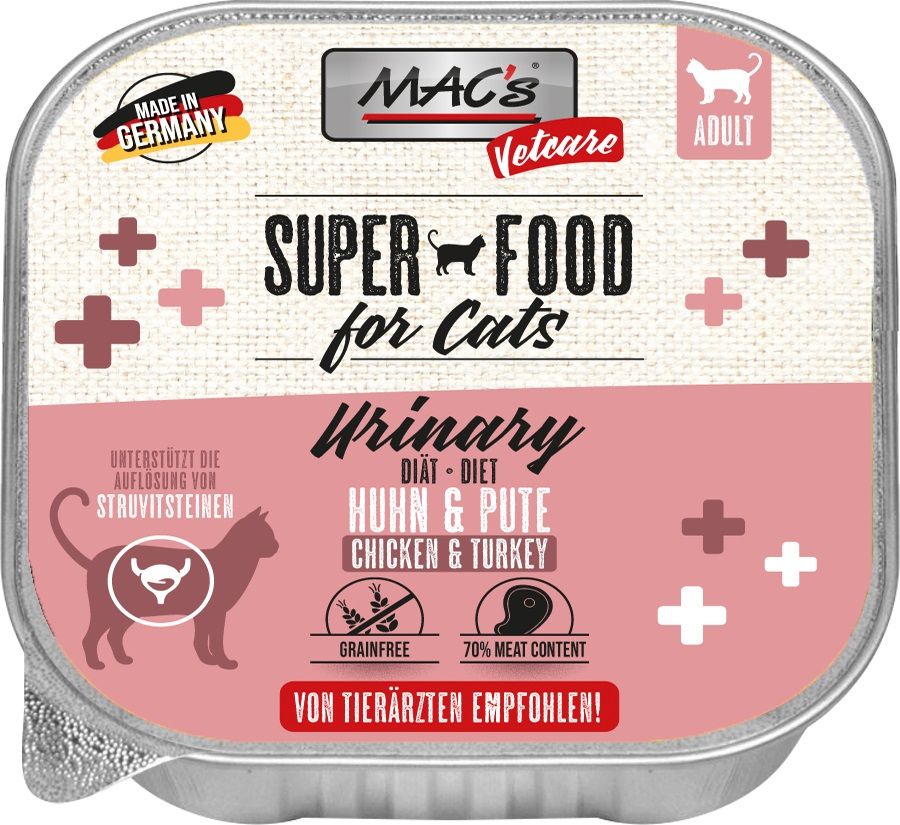 MACs Urinary Huhn & PuteZur Unterstützung der Auflösung von Struvitsteinen.Zusammensetzung:Fleisch (mind. 39% Huhn, 30% Pute) und tierische Nebenerzeugnisse (Hühnerherzen, Hühnermägen, Putenherzen, Putenmägen, Putenlebern), Lachsöl (0,2%), Mineralstoffe.Analytische Bestandteile:Rohprotein 11,0%, Rohfett 5,7%, Rohasche 2,0%, Rohfaser 0,5%, Feuchtigkeit 80,0%, Calcium 0,19%, Phosphor 0,16%, Natrium 0,10%, Chlorid 0,2%, Magnesium 0,03%, Kalium 0,24%,Schwefel 0,2%.Zusatzstoffe:Vitamin D3 200 I.E., Zink als Zinksulfat, Monohydrat 15mg/kg, Mangan als Mangan-II-sulfat, Monohydrat 3mg/kg, Kupfer als Kupfer-II-sulfat, Pentahydrat 0,5mg/kg, Jod als Calciumjodat, wasserfrei 0,75mg/kg, Taurin 1500mg/kg, DL-Methionin 1000mg.Fütterungsempfehlung:Gewicht der Katze Tagesration 2-3kg 086-163g 4kg 137-198g 5kg 159-230g 6kg 180-260g 7kg 200-288g 8-9kg 218-341gBei den Angaben handelt es sich um Richtwerte. Der tatsächliche Nahrungsbedarf Ihres Tieres ist individuell unterschiedlich und kann je nach Alter, Geschlecht, Rasse oder Aktivität abweichen.Diät-Alleinfuttermittel für ausgewachsene Katzen.Inverkehrbringer: Pro Pet Koller GmbH, Messerschmittstr. 4, 53925 Kall, Tel.: 02441/994400, Fax: 02441/99440111, E-Mail: info@propet.de