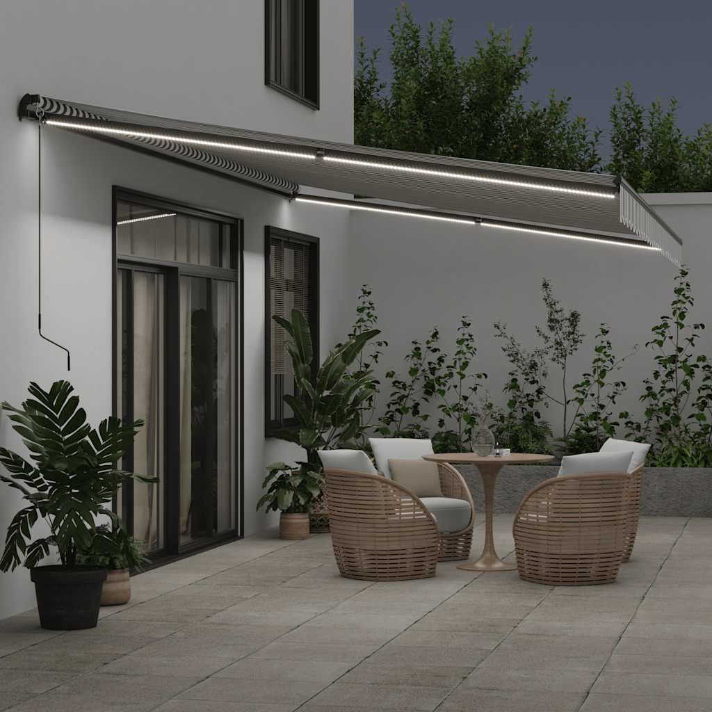 Schaffe einen angenehmen, kühlen Platz auf deiner Terrasse und schütze dich vor UV-Strahlen mit dieser Markise! Langlebiges Material: Der Markisenrahmen ist aus pulverbeschichtetem Aluminium gefertigt, welches Robustheit und Langlebigkeit gewährleistet. Dank PU-Behandlung ist der Markisenstoff UV-beständig. Diese Markise schützt deine Familie und Gäste vor UV-Strahlen und grellem Sonnenlicht.Einfach zu bedienen: Der Winkel und die Höhe können an deine unterschiedlichen Bedürfnisse angepasst werden. Du kannst diese Markise mittels der langen Kurbel leicht ein- und ausfahren.LED-Beleuchtung: Die integrierte LED-Beleuchtung der Gelenkarmmarkise erhellt deinen Außenbereich und schafft ein gemütliches und romantisches Ambiente bei Sonnenuntergang.Vielfältige Einsatzmöglichkeiten: Die Markise mit Kurbel zeichnet sich durch ein einfaches und stilvolles Design aus, das sich gut auf deiner Terrasse oder vor Bistros einfügen wird. Der Sonnenschutz eignet sich für eine Vielzahl von Orten, wie Balkone, Terrassen, Höfe, Restaurants, Cafés, Geschäfte und mehr.