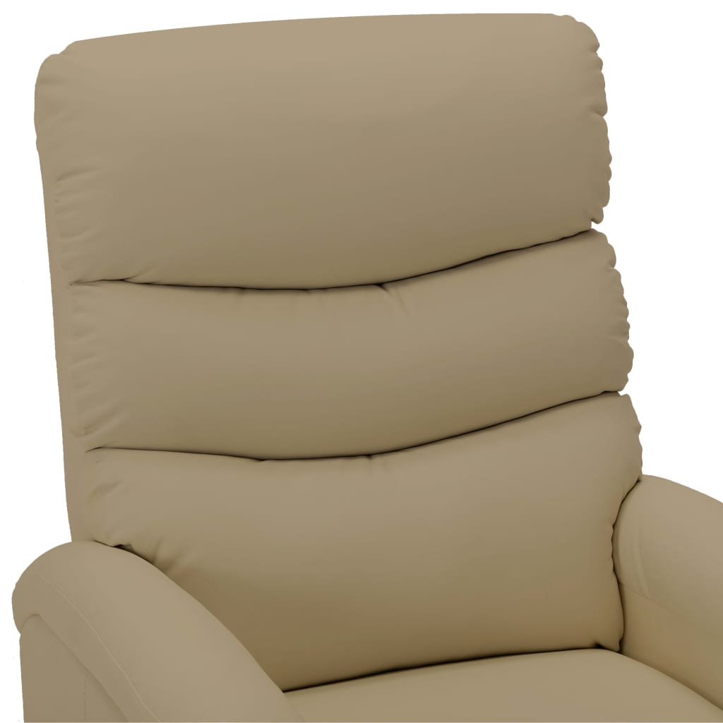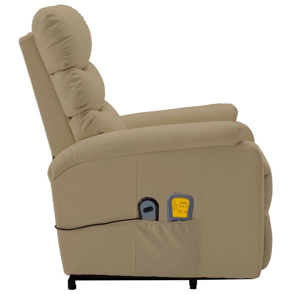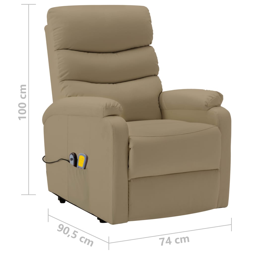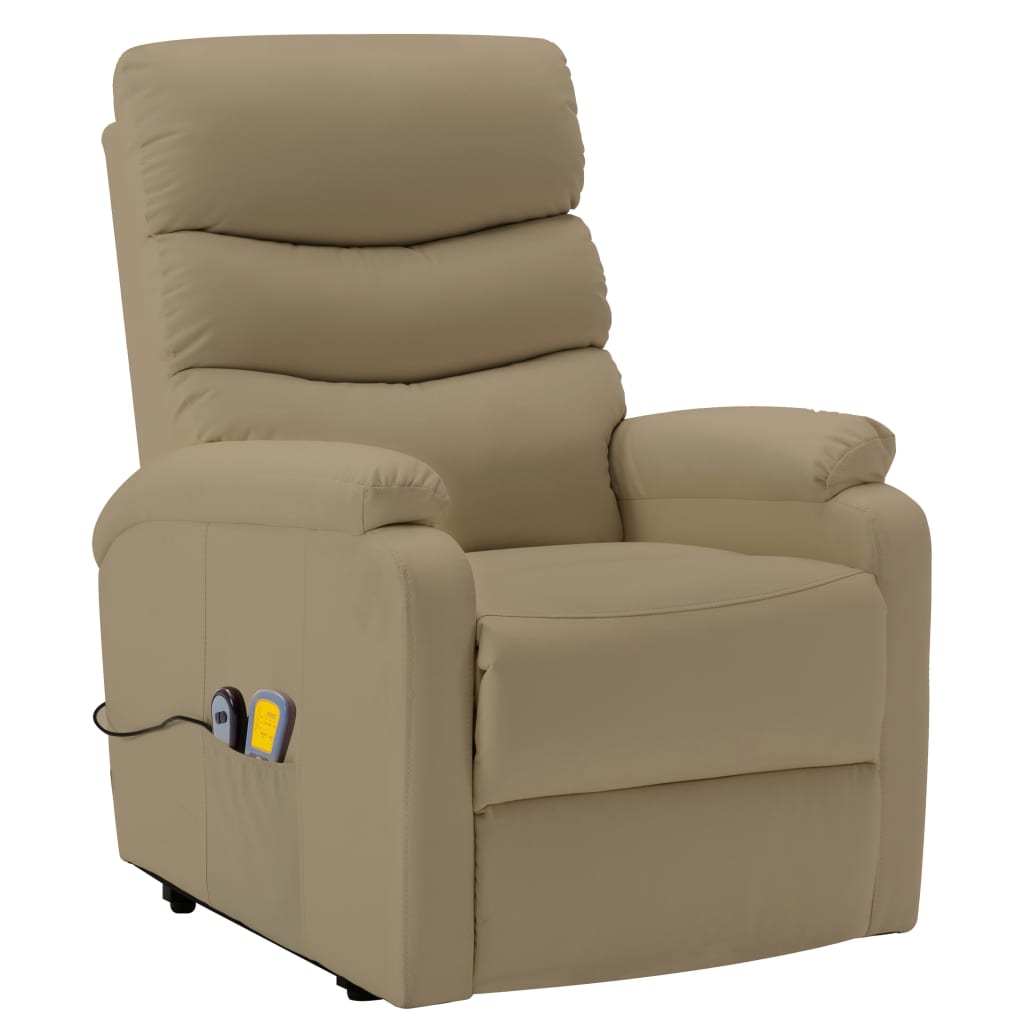 Lehne dich zurück und entspanne dich in diesem äußerst bequemen Massagesessel mit Aufstehhilfe! Manuelle Liegefunktion: Der Sessel kann manuell in 3 Positionen verstellt werden, so dass die Rückenlehne und der Fußteil je nach Bedarf eingestellt werden können.Elektrische Aufstehhilfe: Dieser Relaxsessel ist mit einem Elektromotor zum Anheben ausgestattet. Dank der Aufstehhilfe, die den gesamten Sessel nach oben bringt, kannst du mit der 2-Knopf-Handsteuerung ganz einfach aufstehen, ohne deinen Rücken und deine Knie zu belasten.Vibrationsfunktion: Mit den 6 Massagepunkten kann man eine gezielte Massage genießen. Außerdem ermöglicht die mitgelieferte Handsteuerung die Auswahl verschiedener Massageprogramme. Die Massagefunktion wird über den USB-Anschluss mit Strom betrieben, aber das zugelassene 5V-USB-Netzteil ist nicht im Lieferumfang enthalten.Bequemes Sitzerlebnis: Der dick gepolsterte Sitz, die Rückenlehne und die breiten, mit Kunstleder bezogenen Armlehnen sorgen für ein behagliches und angenehmes Sitzgefühl. Künstliches Leder ist ein äußerst langlebiges Material. Es ist schmutzabweisend und lässt sich mit einem feuchten Tuch einfach reinigen. Durch die glatte Oberfläche weist es die luxuriöse Schönheit von Echtleder auf.Solider und stabiler Rahmen: Der Rahmen aus Holz und Metall sorgt für eine solide Struktur und hohe Stabilität. Dieser TV-Sessel ist bequem und langlebig.