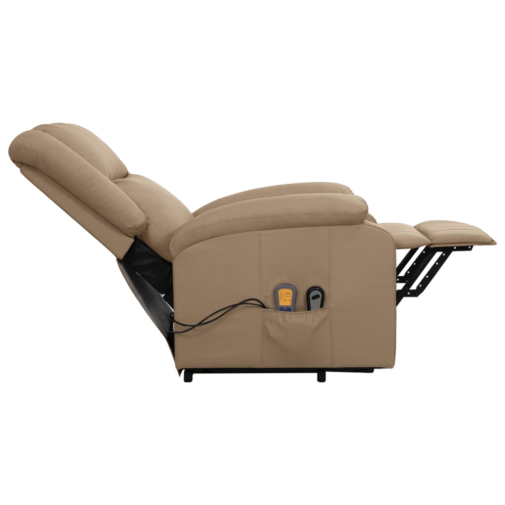 Lehne dich zurück und entspanne dich in diesem äußerst bequemen Massagesessel mit Aufstehhilfe! Manuelle Liegefunktion: Der Sessel kann manuell in 3 Positionen verstellt werden, so dass die Rückenlehne und der Fußteil je nach Bedarf eingestellt werden können.Elektrische Aufstehhilfe: Dieser Relaxsessel ist mit einem Elektromotor zum Anheben ausgestattet. Dank der Aufstehhilfe, die den gesamten Sessel nach oben bringt, kannst du mit der 2-Knopf-Handsteuerung ganz einfach aufstehen, ohne deinen Rücken und deine Knie zu belasten.Vibrationsfunktion: Mit den 6 Massagepunkten kann man eine gezielte Massage genießen. Außerdem ermöglicht die mitgelieferte Handsteuerung die Auswahl verschiedener Massageprogramme. Die Massagefunktion wird über den USB-Anschluss mit Strom betrieben, aber das zugelassene 5V-USB-Netzteil ist nicht im Lieferumfang enthalten.Bequemes Sitzerlebnis: Der dick gepolsterte Sitz, die Rückenlehne und die breiten, mit Kunstleder bezogenen Armlehnen sorgen für ein behagliches und angenehmes Sitzgefühl. Künstliches Leder ist ein äußerst langlebiges Material. Es ist schmutzabweisend und lässt sich mit einem feuchten Tuch einfach reinigen. Durch die glatte Oberfläche weist es die luxuriöse Schönheit von Echtleder auf.Solider und stabiler Rahmen: Der Rahmen aus Holz und Metall sorgt für eine solide Struktur und hohe Stabilität. Dieser TV-Sessel ist bequem und langlebig.