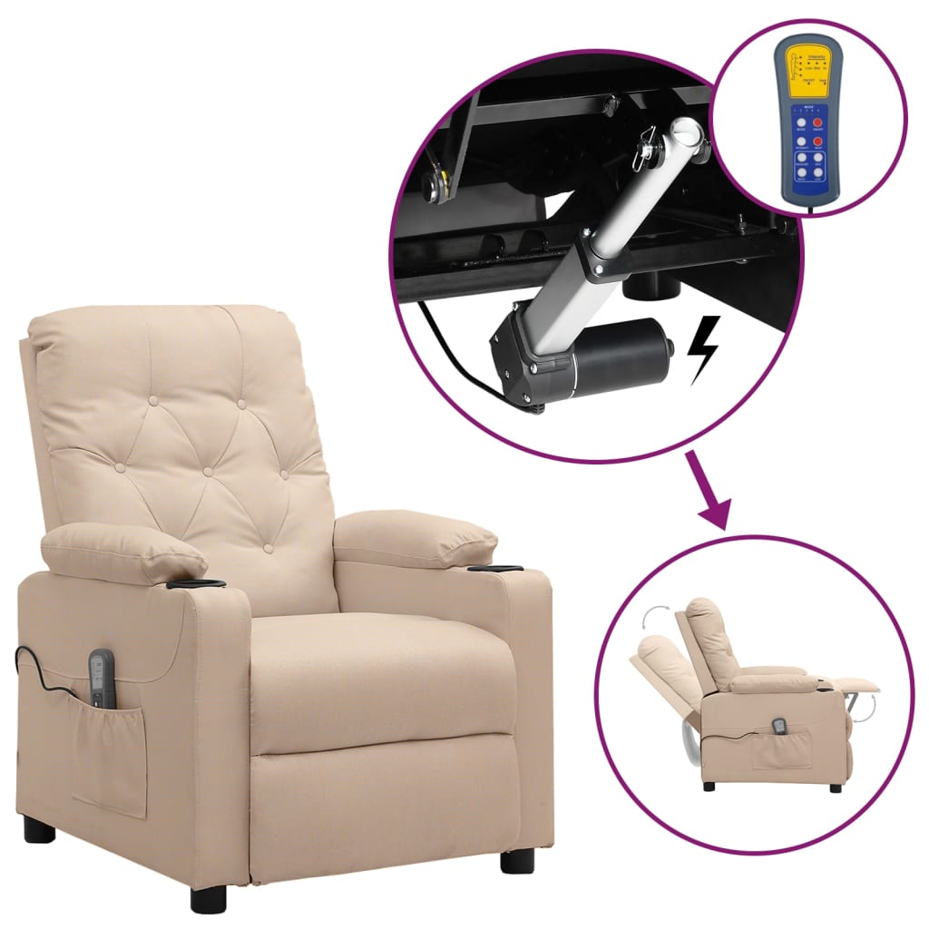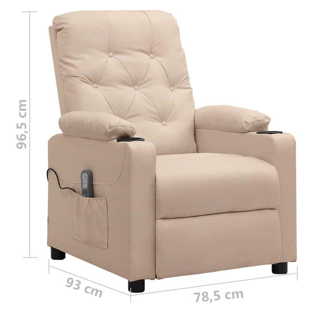 Lehne dich zurück und entspanne dich in diesem äußerst bequemen Massagesessel mit Aufstehhilfe! Manuelle Liegefunktion: Der Sessel kann manuell in 3 Positionen verstellt werden, so dass die Rückenlehne und der Fußteil je nach Bedarf eingestellt werden können.Elektrische Aufstehhilfe: Dieser Relaxsessel ist mit einem Elektromotor zum Anheben ausgestattet. Dank der Aufstehhilfe, die den gesamten Sessel nach oben bringt, kannst du mit der 2-Knopf-Handsteuerung ganz einfach aufstehen, ohne deinen Rücken und deine Knie zu belasten.Vibrationsfunktion: Mit den 6 Massagepunkten kann man eine gezielte Massage genießen. Außerdem ermöglicht die mitgelieferte Handsteuerung die Auswahl verschiedener Massageprogramme. Die Massagefunktion wird über den USB-Anschluss mit Strom betrieben, aber das zugelassene 5V-USB-Netzteil ist nicht im Lieferumfang enthalten.Bequemes Sitzerlebnis: Die dick gepolsterte Sitzfläche, die Rückenlehne und die breiten Armlehnen sorgen für ein behagliches und wohliges Sitzgefühl. Der Bezug aus Stoff hat ein schlichtes und sauberes Aussehen, ist atmungsaktiv und langlebig.Solider und stabiler Rahmen: Der Rahmen aus Holz und Metall sorgt für eine solide Struktur und hohe Stabilität. Dieser TV-Sessel ist bequem und langlebig.