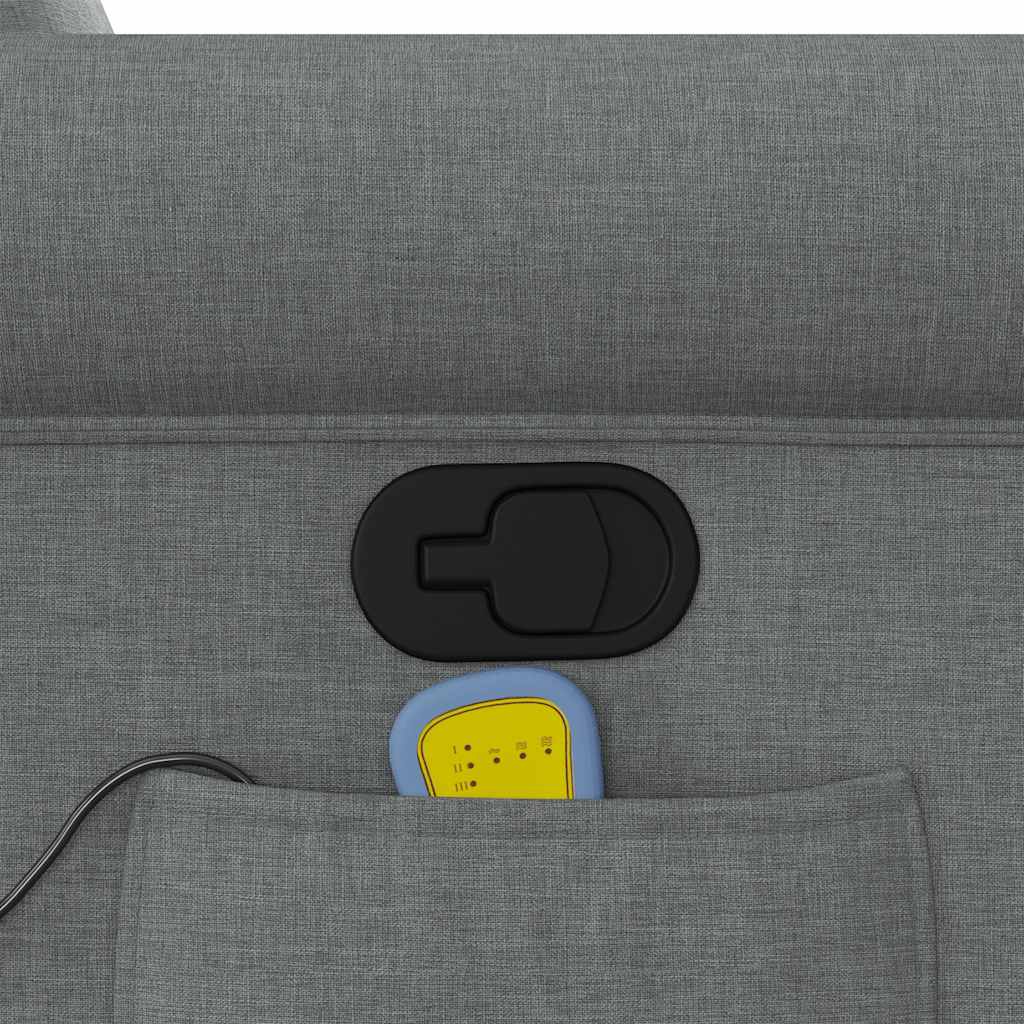Lehne dich zurück und entspanne dich in diesem äußerst bequemen Massagesessel mit Aufstehhilfe! Elektrische Aufstehhilfe: Dieser Relaxsessel ist mit einem Elektromotor zum Anheben ausgestattet. Dank der Aufstehhilfe, die den gesamten Sessel nach oben bringt, kannst du ganz einfach auf Knopfdruck aufstehen, ohne deinen Rücken und deine Knie zu belasten.Manuelle Liegefunktion: Dieser Ruhesessel lässt sich mittels des Griffs an der rechten Seite verstellen. So kannst du das Fußteil und die Rückenlehne manuell in jede beliebige Position bringen, um höchsten Komfort zu genießen. Die Rückenlehne lässt sich max. 135 Grad nach hinten verstellen. Durch einfaches Ziehen lässt sie sich schnell wieder in die ursprüngliche Position bringen.Vibrationsfunktion: Dank der 6 Massagepunkte genießt du eine gezielte Massage. Zudem lassen sich verschiedene Massageprogramme über die mitgelieferte Handsteuerung auswählen. Die Massagefunktion wird über den USB-Anschluss betrieben, der eine zertifizierte 5-V-USB-Stromquelle erfordert (nicht im Lieferumfang enthalten).Bequemes Sitzerlebnis: Die dick gepolsterte Sitzfläche, die Rückenlehne und die breiten Armlehnen sorgen für ein behagliches und wohliges Sitzgefühl. Der Bezug aus Stoff weist eine schlichte und saubere Optik auf und ist auch atmungsaktiv und langlebig.Praktische Seitentasche: Dieser Sessel verfügt über eine Seitentasche, in der du deine Fernbedienung oder andere wichtige Sachen griffbereit aufbewahren kannst.Solider und stabiler Rahmen: Der Rahmen aus Holz und Metall sorgt für eine solide Struktur und hohe Stabilität. Dieser TV-Sessel ist bequem und langlebig.