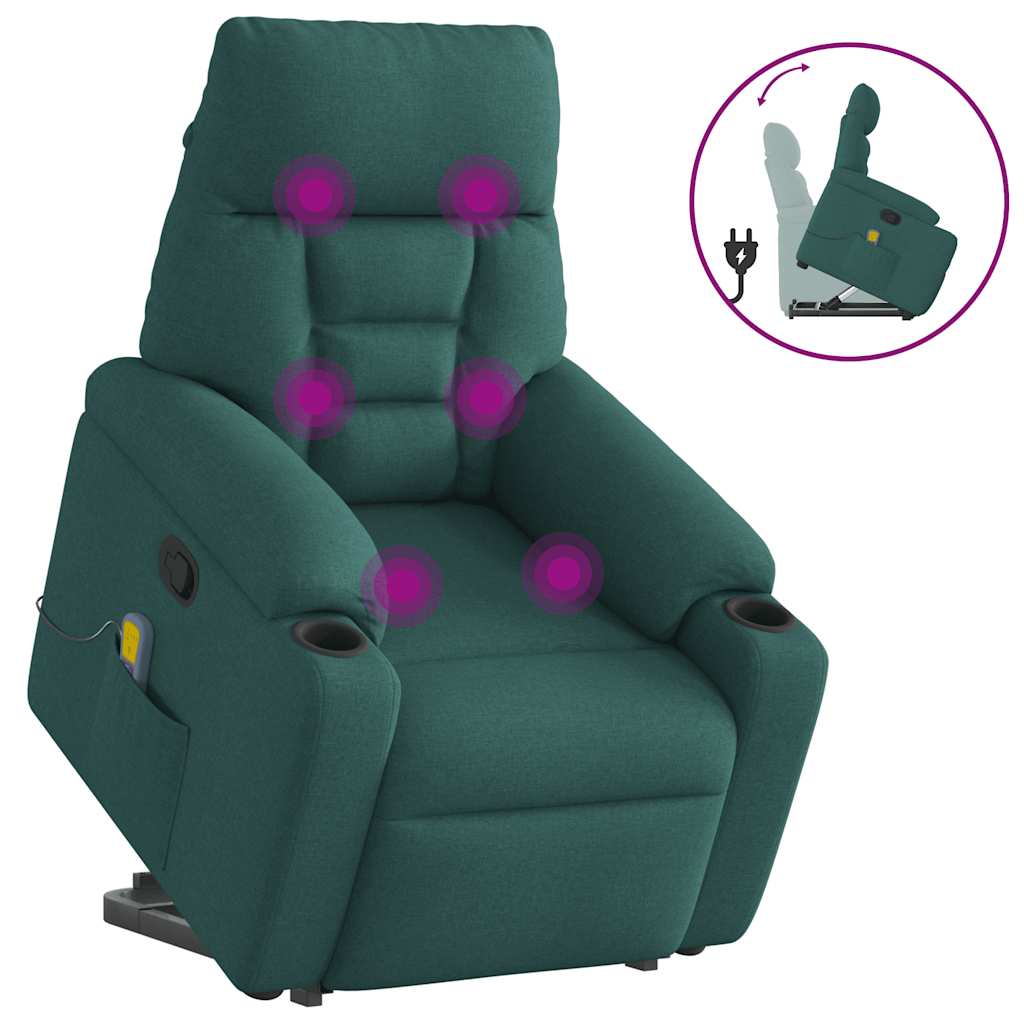 Lehne dich zurück und entspanne dich in diesem äußerst bequemen Massagesessel mit Aufstehhilfe! Elektrische Aufstehhilfe: Dieser Relaxsessel ist mit einem Elektromotor zum Anheben ausgestattet. Dank der Aufstehhilfe, die den gesamten Sessel nach oben bringt, kannst du ganz einfach auf Knopfdruck aufstehen, ohne deinen Rücken und deine Knie zu belasten.Manuelle Liegefunktion: Dieser Ruhesessel lässt sich mittels des Griffs an der rechten Seite verstellen. So kannst du das Fußteil und die Rückenlehne manuell in jede beliebige Position bringen, um höchsten Komfort zu genießen. Die Rückenlehne lässt sich max. 135 Grad nach hinten verstellen. Durch einfaches Ziehen lässt sie sich schnell wieder in die ursprüngliche Position bringen.Vibrationsfunktion: Dank der 6 Massagepunkte genießt du eine gezielte Massage. Zudem lassen sich verschiedene Massageprogramme über die mitgelieferte Handsteuerung auswählen. Die Massagefunktion wird über den USB-Anschluss betrieben, der eine zertifizierte 5-V-USB-Stromquelle erfordert (nicht im Lieferumfang enthalten).Bequemes Sitzerlebnis: Die dick gepolsterte Sitzfläche, die Rückenlehne und die breiten Armlehnen sorgen für ein behagliches und wohliges Sitzgefühl. Der Bezug aus Stoff weist eine schlichte und saubere Optik auf und ist auch atmungsaktiv und langlebig.Praktische Getränkehalter und Seitentasche: Dieser Sessel verfügt über zwei praktische Getränkehalter und eine Seitentasche, in der du deine Fernbedienung oder andere wichtige Sachen griffbereit aufbewahren kannst.Solider und stabiler Rahmen: Der Rahmen aus Holz und Metall sorgt für eine solide Struktur und hohe Stabilität. Dieser TV-Sessel ist bequem und langlebig.