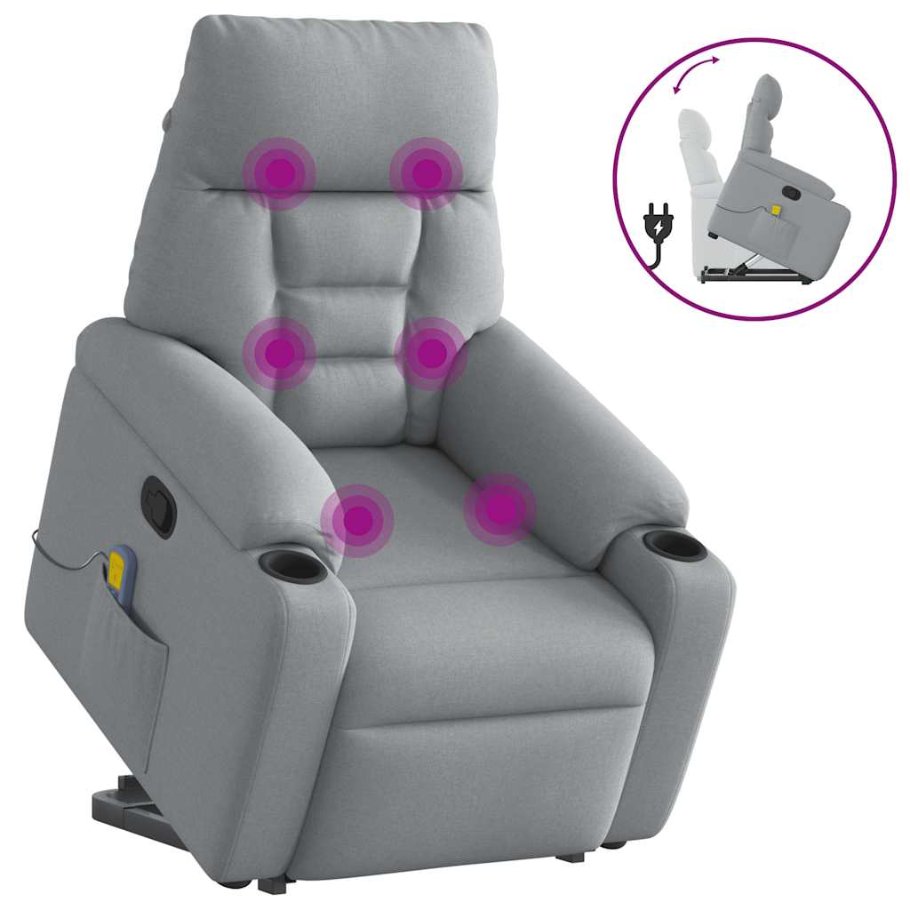 Lehne dich zurück und entspanne dich in diesem äußerst bequemen Massagesessel mit Aufstehhilfe! Elektrische Aufstehhilfe: Dieser Relaxsessel ist mit einem Elektromotor zum Anheben ausgestattet. Dank der Aufstehhilfe, die den gesamten Sessel nach oben bringt, kannst du ganz einfach auf Knopfdruck aufstehen, ohne deinen Rücken und deine Knie zu belasten.Manuelle Liegefunktion: Dieser Ruhesessel lässt sich mittels des Griffs an der rechten Seite verstellen. So kannst du das Fußteil und die Rückenlehne manuell in jede beliebige Position bringen, um höchsten Komfort zu genießen. Die Rückenlehne lässt sich max. 135 Grad nach hinten verstellen. Durch einfaches Ziehen lässt sie sich schnell wieder in die ursprüngliche Position bringen.Vibrationsfunktion: Dank der 6 Massagepunkte genießt du eine gezielte Massage. Zudem lassen sich verschiedene Massageprogramme über die mitgelieferte Handsteuerung auswählen. Die Massagefunktion wird über den USB-Anschluss betrieben, der eine zertifizierte 5-V-USB-Stromquelle erfordert (nicht im Lieferumfang enthalten).Bequemes Sitzerlebnis: Die dick gepolsterte Sitzfläche, die Rückenlehne und die breiten Armlehnen sorgen für ein behagliches und wohliges Sitzgefühl. Der Bezug aus Stoff weist eine schlichte und saubere Optik auf und ist auch atmungsaktiv und langlebig.Praktische Getränkehalter und Seitentasche: Dieser Sessel verfügt über zwei praktische Getränkehalter und eine Seitentasche, in der du deine Fernbedienung oder andere wichtige Sachen griffbereit aufbewahren kannst.Solider und stabiler Rahmen: Der Rahmen aus Holz und Metall sorgt für eine solide Struktur und hohe Stabilität. Dieser TV-Sessel ist bequem und langlebig.