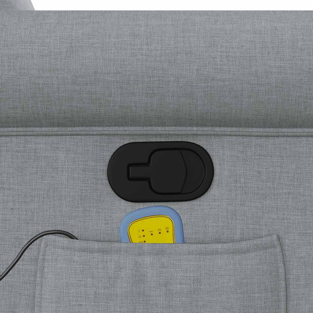 Lehne dich zurück und entspanne dich in diesem äußerst bequemen Massagesessel mit Aufstehhilfe! Elektrische Aufstehhilfe: Dieser Relaxsessel ist mit einem Elektromotor zum Anheben ausgestattet. Dank der Aufstehhilfe, die den gesamten Sessel nach oben bringt, kannst du ganz einfach auf Knopfdruck aufstehen, ohne deinen Rücken und deine Knie zu belasten.Manuelle Liegefunktion: Dieser Ruhesessel lässt sich mittels des Griffs an der rechten Seite verstellen. So kannst du das Fußteil und die Rückenlehne manuell in jede beliebige Position bringen, um höchsten Komfort zu genießen. Die Rückenlehne lässt sich max. 135 Grad nach hinten verstellen. Durch einfaches Ziehen lässt sie sich schnell wieder in die ursprüngliche Position bringen.Vibrationsfunktion: Dank der 6 Massagepunkte genießt du eine gezielte Massage. Zudem lassen sich verschiedene Massageprogramme über die mitgelieferte Handsteuerung auswählen. Die Massagefunktion wird über den USB-Anschluss betrieben, der eine zertifizierte 5-V-USB-Stromquelle erfordert (nicht im Lieferumfang enthalten).Bequemes Sitzerlebnis: Die dick gepolsterte Sitzfläche, die Rückenlehne und die breiten Armlehnen sorgen für ein behagliches und wohliges Sitzgefühl. Der Bezug aus Stoff weist eine schlichte und saubere Optik auf und ist auch atmungsaktiv und langlebig.Praktische Seitentasche: Dieser Sessel verfügt über eine Seitentasche, in der du deine Fernbedienung oder andere wichtige Sachen griffbereit aufbewahren kannst.Solider und stabiler Rahmen: Der Rahmen aus Holz und Metall sorgt für eine solide Struktur und hohe Stabilität. Dieser TV-Sessel ist bequem und langlebig.