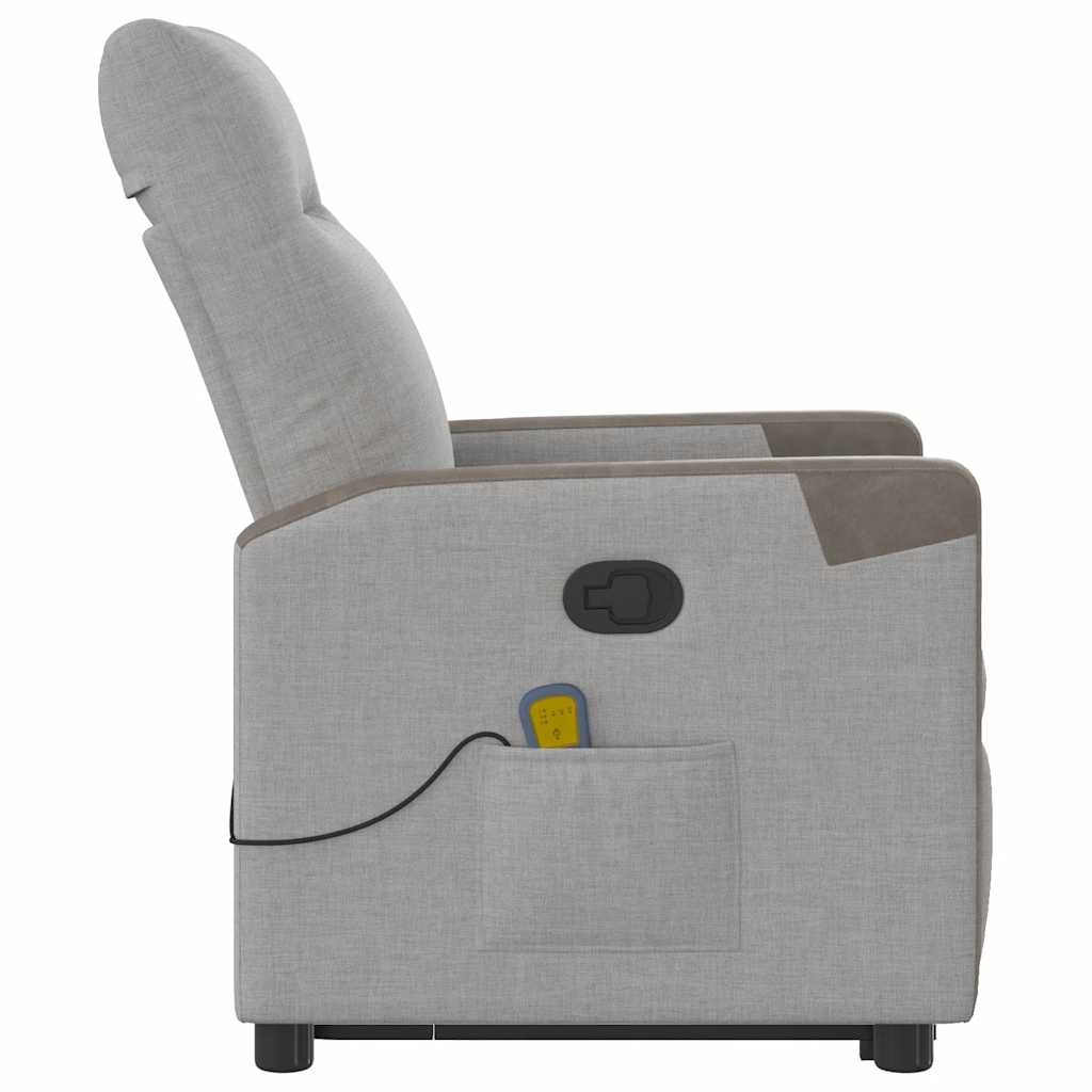 Lehne dich zurück und entspanne dich in diesem äußerst bequemen Massagesessel mit Aufstehhilfe! Elektrische Aufstehhilfe: Dieser Relaxsessel ist mit einem Elektromotor zum Anheben ausgestattet. Dank der Aufstehhilfe, die den gesamten Sessel nach oben bringt, kannst du ganz einfach auf Knopfdruck aufstehen, ohne deinen Rücken und deine Knie zu belasten.Manuelle Liegefunktion: Dieser Ruhesessel lässt sich mittels des Griffs an der rechten Seite verstellen. So kannst du das Fußteil und die Rückenlehne manuell in jede beliebige Position bringen, um höchsten Komfort zu genießen. Die Rückenlehne lässt sich max. 135 Grad nach hinten verstellen. Durch einfaches Ziehen lässt sie sich schnell wieder in die ursprüngliche Position bringen.Vibrationsfunktion: Dank der 6 Massagepunkte genießt du eine gezielte Massage. Zudem lassen sich verschiedene Massageprogramme über die mitgelieferte Handsteuerung auswählen. Die Massagefunktion wird über den USB-Anschluss betrieben, der eine zertifizierte 5-V-USB-Stromquelle erfordert (nicht im Lieferumfang enthalten).Bequemes Sitzerlebnis: Die dick gepolsterte Sitzfläche, die Rückenlehne und die breiten Armlehnen sorgen für ein behagliches und wohliges Sitzgefühl. Der Bezug aus Stoff weist eine schlichte und saubere Optik auf und ist auch atmungsaktiv und langlebig.Praktische Seitentasche: Dieser Sessel verfügt über eine Seitentasche, in der du wichtige Sachen griffbereit aufbewahren kannst.Solider und stabiler Rahmen: Der Rahmen aus Holz und Metall sorgt für eine solide Struktur und hohe Stabilität. Dieser TV-Sessel ist bequem und langlebig.