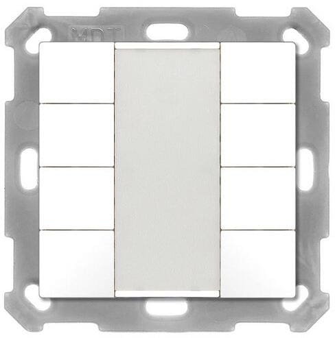 KNX Taster 55 8-fach, Reinweiß glänzend. Ausführung mit 8 Tasten. Passend für 55 mm Schalterprogramme z.B.: GIRA Standard 55, E2, E22, Event, Esprit oder BERKER S1, B3, B7 oder JUNG A 500, A PLUS, A CREATION, AS 500, A550, A FLOW oder MERTEN 1M, M-Smart, M-Plan, M-Pure. Mittiges Schriftfeld mit Deckfolie zur individuellen Beschriftung. Die Tasten sind als Tastenpaar oder Einzeltasten frei einstellbar. Ein- und Zweitasterbetrieb für Schalten, Dimmen, Jalousie, Werte. Innovative Gruppensteuerung mit langem/extra langem Tastendruck. Werte/Szenen umschalten mit bis zu 4 Werten. Kurzer/langer Tastendruck mit 2 Objekten. 4 Logikblöcke. Einbau in Schalterdose mit mitgeliefertem Tragring. Integrierter Busankoppler.