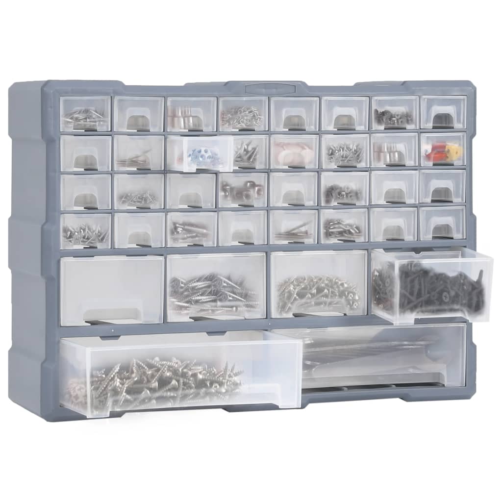 Dieser Multi-Schubladen-Organizer gehört in jede Garage oder Werkstatt. Mit insgesamt 40 Schubladen ist der Organizer für die übersichtliche Aufbewahrung einer Vielzahl von Gegenständen konzipiert, kann aber auch als Näh- oder Nagelkasten verwendet werden. Diese Aufbewahrungseinheit enthält 34 kleine Schubladen, 4 mittlere Schubladen und 2 große Schubladen, um Ihren unterschiedlichen Anforderungen gerecht zu werden. Damit können Sie Ihre Handwerkzeuge und Zubehörteile wie Befestigungselemente organisiert und in Reichweite aufbewahren. Der Werkzeugschrank besteht aus schlagfestem Kunststoff, der sowohl langlebig als auch robust ist. Die Schubladen bestehen aus durchsichtigem Kunststoff, damit Sie deren Inhalt schnell identifizieren können. Diese Bastelbox ist ideal für die Aufbewahrung von Muttern, Bolzen, Schrauben, Nägeln, allgemeinen Befestigungen und Komponenten. Dieser Artikel kann an der Wand montiert und einzeln als Werkzeug-Organizer verwendet werden.