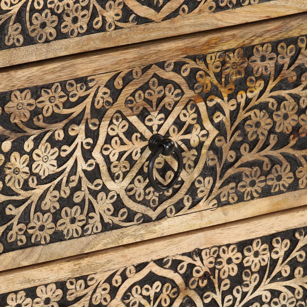 Dieser Nachttisch mit elegantem Design ist eine zeitlose Ergänzung deiner Inneneinrichtung. Massives Mangholz: Massives Mangoholz ist ein robustes, tropisches Hartholz, aus dem sich robuste Möbel herstellen lassen. Seine optisch ansprechende Holzmaserung macht jedes Möbelstück zu einem Unikat. Der Schrank ist aus massivem Mangoholz gefertigt und daher langlebig und stabil.Viel Stauraum: Der Nachttisch ist mit 3 Schubladen ausgestattet, um verschiedene Sachen ordentlich und griffbereit aufzubewahren.Stabile Oberplatte: Die Oberplatte des Beistellschranks bietet den perfekten Platz, um Dekoartikel, Bilderrahmen und Topfpflanzen zur Schau zu stellen.Starke Beine: Die Eisenbeine tragen zur Robustheit und Stabilität der Nachtkommode bei.Retro-Stil: Mit einem handgeschnitzten Blumenmuster versehen, bringt dieser Nachttisch den Luxus des Retro-Stils in dein Interieur und wird überall ein echter Hingucker sein. Gut zu wissen:Jedes Stück ist ein Unikat, das in Farbe und Maserung variiert. Die Lieferung erfolgt in zufälliger Reihenfolge, wodurch die Exklusivität und Individualität deines Produkts gewährleistet wird. Achtung:Um ein Umkippen zu vermeiden, sollte dieses Produkt mit der mitgelieferten Wandhalterung gesichert werden.