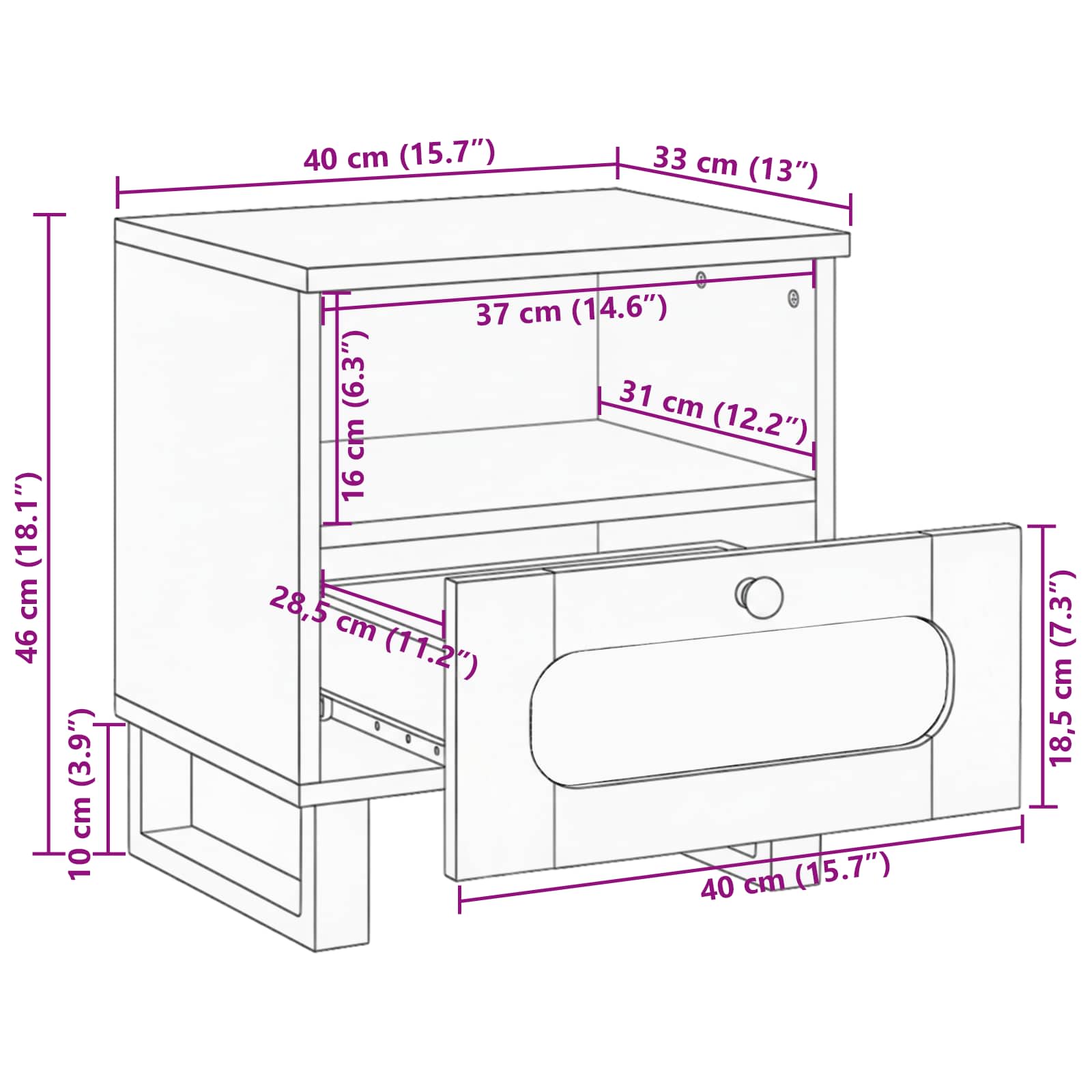 Dieser Nachttisch bringt einen schicken Touch in jedes Schlafzimmer und verbindet dabei Form und Funktion perfekt. Mit seinem schlanken, rechteckigen Design in warmem Braun wertet er jede Inneneinrichtung auf. Perfekt für persönliche Dinge, überzeugt er mit einer hübsch gestalteten Oberfläche aus massivem Mangoholz. Ideal neben deinem Bett platziert, hast du Lampen, Wecker oder Bücher immer griffbereit. Robustes Mango Holz: Dieser Nachttisch aus hochwertigem massivem Mangoholz ist extrem stark und langlebig. Dieses Material ist bekannt für seine Robustheit und zeitlose Anziehung, sodass der Nachttisch dir über viele Jahre treu bleibt. Viel Stauraum: Der Nachttisch wurde mit Funktionalität im Kopf entworfen und hat eine geräumige Schublade für deine persönlichen Dinge. Ob Bücher, Brillen oder abendliche Snacks ? der Platz ist mehr als ausreichend. Kompaktes Design: Mit den Maßen von 40 x 33 x 46 cm bietet der Nachttisch viele Vorteile, ohne deinen Raum zu überladen. Er passt perfekt in kleinere Schlafzimmer, wo große Funktionalität wichtig ist, auch wenn der Platz klein ist. Elegante Ästhetik: Das warme Braun des Nachttischs erhöht seinen Stil und macht ihn vielseitig einsetzbar, passend von modern bis traditionell. Er bringt mühelos Wärme und Eleganz in jede Raumatmosphäre. Durchdachte Merkmale: Dieser Nachttisch ist nicht nur hübsch, sondern auch praktisch. Seine veredelte Rückseite sieht von allen Seiten gut aus und die einfache Montage sorgt dafür, dass du ihn schnell in dein Zuhause integrieren kannst.