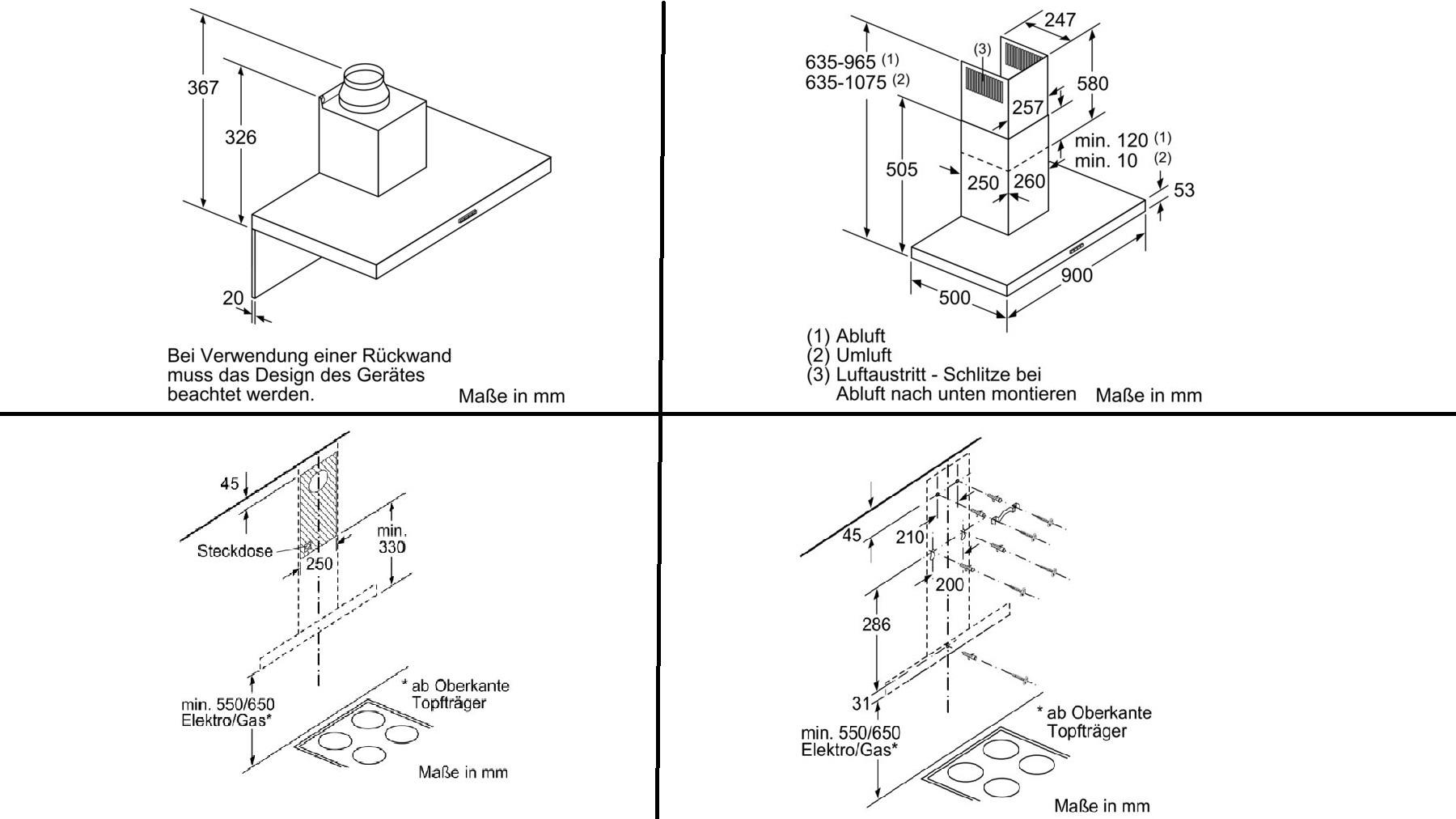 - Gerätemaße Abluft (HxBxT): 635-965 x 900 x 500 mm