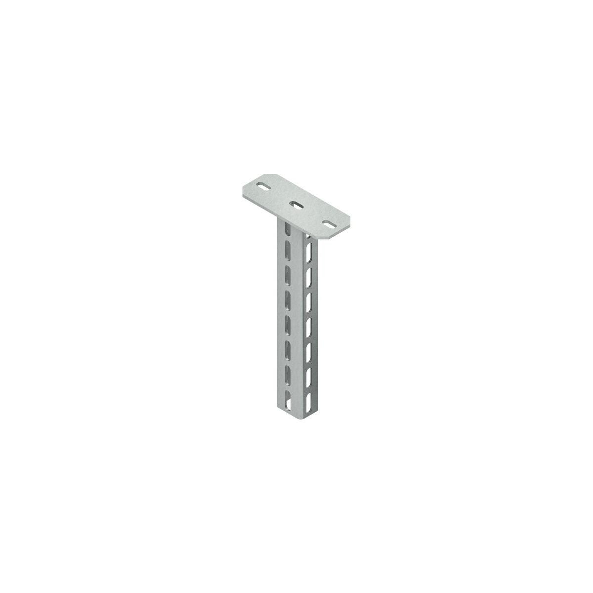 Hängestiel, 3-seitig durchgehend gelochtes U-Profil mit angeschweißter Kopfplatte, System HU 6040/..., für Ausleger zur ein-/zwei- und dreiseitigen Verlegung, um die Verformung des Hängestielprofils bei der Montage von Ausleger zu verhindern, ist aus statischen Gründen das Hängestiel-Distanzprofil HDS 60.40 F mit Sechskantschraube zu berücksichtigen, bei einer einseitigen Befestigung des Auslegers am Hängestielprofil ist bevorzugt die geschlossene Seite des Auslegers fluchtend mit dem Profilsteg des Hängestiels anzubringen.