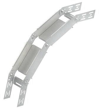 Bogen, verstellbar, vertikal, für den vertikalen Höhenversatz, für Kabelrinnen, mehrteilig, einschließlich 2 Gelenkstücke RGE..., 2 Kantenschutzbleche RKB..., 2 Gelenkverbinder RGV..., einschließlich anteilmäßigem Befestigungszubehör. Bodenbleche und Seitenteile sind mit abgerundeten Kanten zum Schutz der Kabel am Übergang versehen.