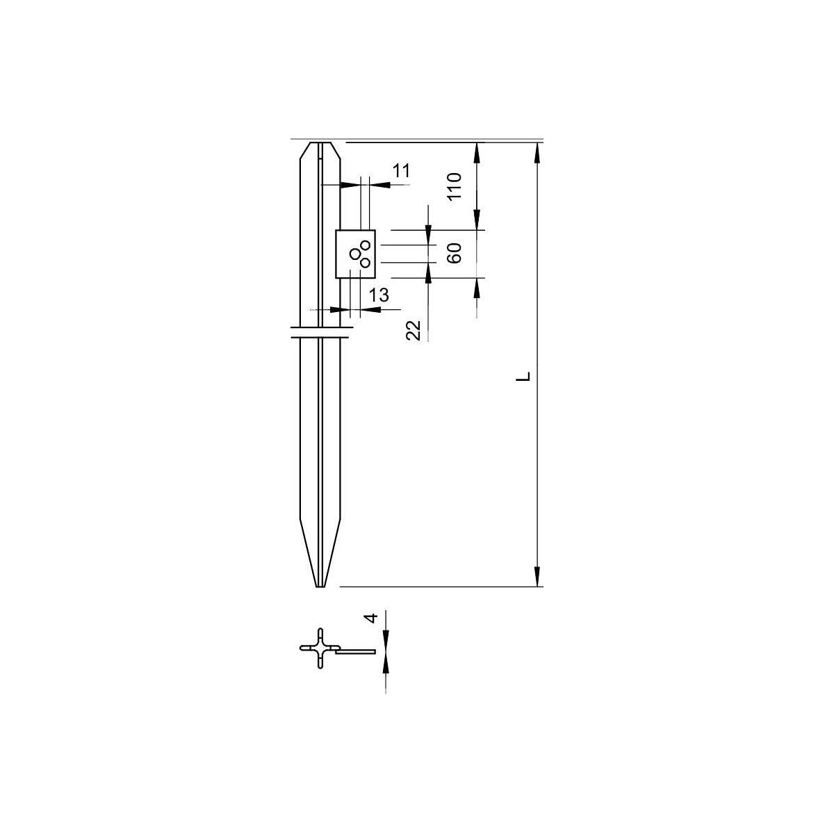 Kreuzerder mit Anschlusslasche, Kreuzprofil 50 x 50 x 3 mm, 1 Durchgangsloch Ø 13 mm, 2 Durchgangslöcher Ø 11 mm. Rundleiterbefestigung z. B. mit Typ 5001 DIN-FT möglich. Zum Errichten von Erdungsanlagen z. B. für Antennen oder Baustromverteiler-Erdungen.