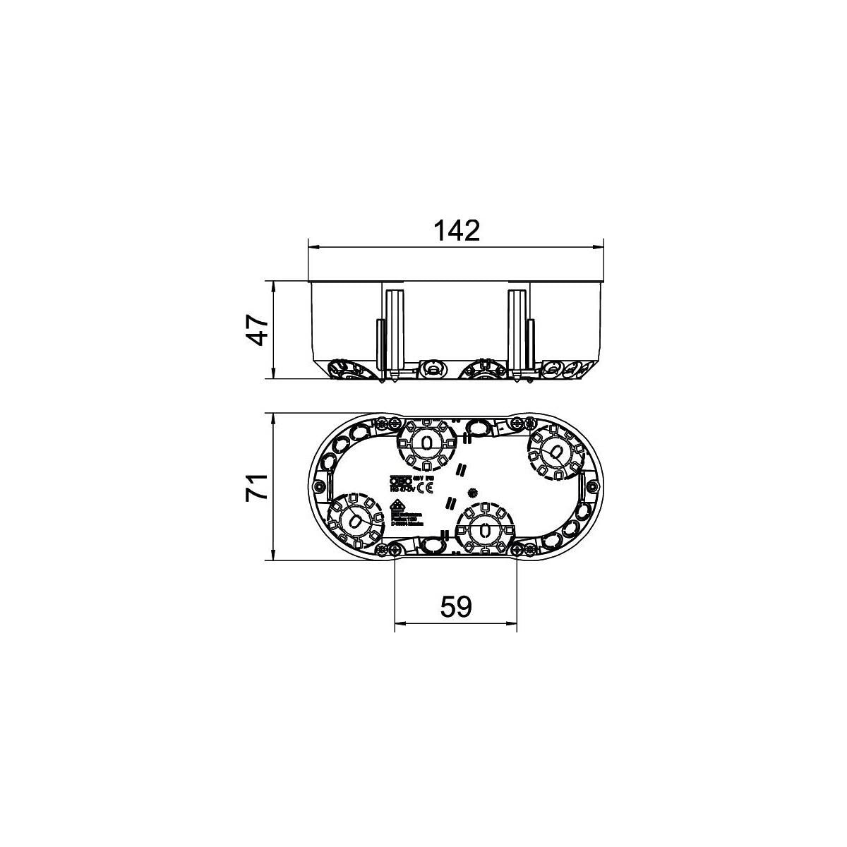 - Doppelte Hohlwand-Gerätedose für den Einsatz in Hohlwänden mit einer Einbautiefe von mindestens 47 mm und einer Plattenstärke von 5 - 40 mm.