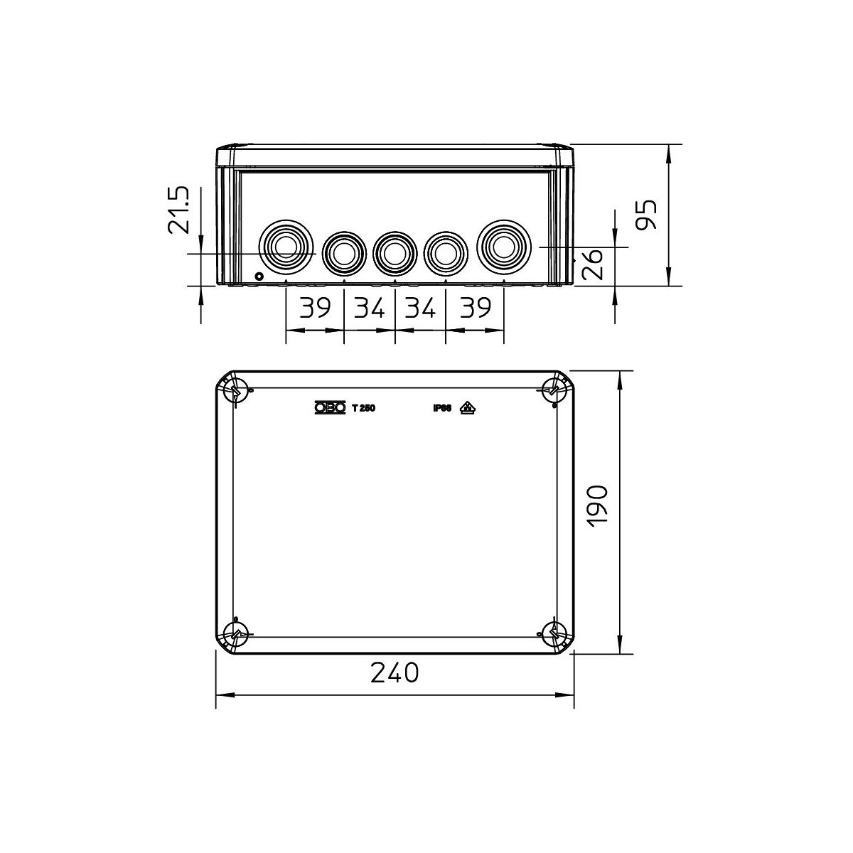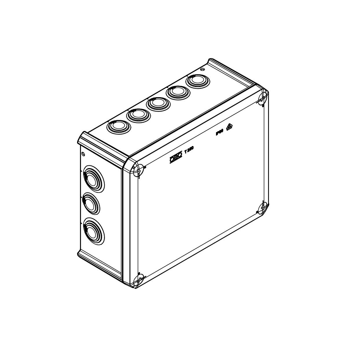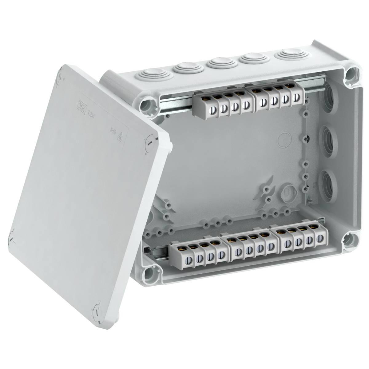 Kabelabzweigkasten mit Klemmleiste zum Verbinden von Kabeln und Leitungen im Innenbereich und geschützten Außenbereichen. Rechteckige Form mit Einsteckdichtungen an den Seiten und Ausschlageinführungen im Boden. Geeignet für die Wand-/ Deckenmontage, die Montage auf Montageblechen und Gewinde im Boden.