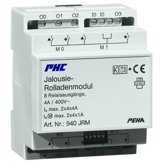 Jalousie-/Rollladenmodul zum Aufrasten auf DIN-Tragschiene, 8 Relaisausgänge 4 A zum Schalten von 4 Rollladen mit 230-V~-Motoren, 230 V AC/1 A Motoren, inkl. Verbindungskabel 30 cm,72 mm breit (4 TE).