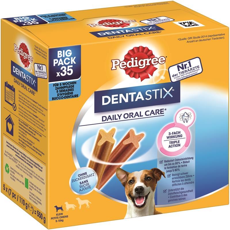 Ped. Denta Stix Daily Care Analytische Bestandteile (%): Protein: 8.1; Fettgehalt: 1.3; anorganischer Stoff: 6.3; Rohfaser: 0.20; Feuchtigkeit: 15.4; Brennwert: 301 kcal/100 g.Zusammensetzung: Getreide, pflanzliche Nebenerzeugnisse, Mineralstoffe (u.a. Natrium Tripolyphosphat 2.3%), Fleisch und tierische Nebenerzeugnisse, Öle und Fette.Ernährungsphysiologische Zusatzstoffe: Vitamin E: 1365 mg, Zink (Zinksulfat Heptahydrat): 190 mg / Sensorische Zusatzstoffe: Rind Geschmack: 11.5 mg, Huhn Geschmack: 20.1 mg.Fütterungsempfehlung: Kleine Hunde, z.B. Dackel, 1 Stick täglich. Dieser Snack ist für Hunde zwischen 5 kg und 10 kg geeignet. Er ist nicht geeignet für junge Hunde unter 4 Monaten. Ein Extranapf mit frischem Trinkwasser sollte immer bereitstehen.Ergänzungsfuttermittel für Hunde ab 4 Monaten.Inverkehrbringer: MARS GmbH, Eitzer Straße 215, 27283 Verden (Aller), Tel.: 04231/940, E-Mail: kontakt@dep.mars.com