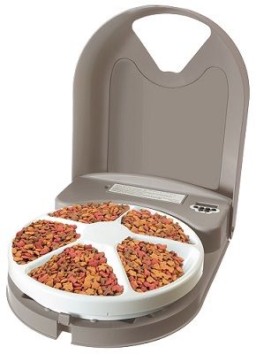 PetSafe Futterautomat für 5 MahlzeitenMit dem PetSafe Futterautomaten für 5 Mahlzeiten erhält Ihr Haustier auch dann pünktlich sein Futter, wenn es bei Ihnen einmal später wird. Die herausnehmbare Schale hat fünf Fächer, die Sie mit je 237 ml (1 Cup) trockenem oder halbtrockenem Futter füllen können. Mit der digitalen Zeitschaltuhr können Sie täglich vorab bis zu fünf Mahlzeiten für Ihr Haustier programmieren. Dies ist auf die Minute genau möglich. Ihr Haustier wird dadurch jeden Tag automatisch zur selben Zeit gefüttert. Es hat jeweils Zugang zum vorderen Fach des Futterautomaten. Wenn es Zeit für die nächste Futtergabe ist, dreht sich die Schale um ein Fach weiter. Wenn Ihr Hund zum Schlingen neigt oder Sie das Gewicht Ihres Haustiers kontrollieren möchten, können Sie mit dem Futterautomaten für 5 Mahlzeiten kleinere Portionen planen. Zum Reinigen legen Sie die Schale einfach in den oberen Korb des Geschirrspülers. Ihr Haustier hat das Beste verdient. PetSafe trägt dazu bei, dass Ihr Haustier gesund, sicher und zufrieden ist.FeaturesGeplante Mahlzeiten – Sie können pro Tag die Gabe von bis zu fünf Mahlzeiten minutengenau planen.Futterkapazität – Jedes Fach der herausnehmbaren Schale kann mit 237 ml (1 Cup) trockenem oder halbtrockenem Futter gefüllt werden. Erfreuen Sie Ihr Haustier den Tag über mit mehreren kleinen Snacks.Gewichtskontrolle – Planen Sie den Tag über mehrere kleinere Portionen, um die Gesundheit Ihres Haustiers zu fördern.Jetzt füttern – Mit der Taste „Jetzt füttern“ können Sie Ihrem Haustier eine zusätzliche Portion (oder einen Snack) füttern. Die nächste geplante Fütterung erfolgt zur festgelegten Uhrzeit.Fütterung aussetzen – Wenn Sie und Ihr Haustier nicht zu Hause sind, können Sie die nächste Futtergabe am Futterautomaten aussetzen, während alle weiteren programmierten Fütterungen planmäßig erfolgen.Spülmaschinenfest – Die BPA-freie Kunststoffschale kann zur Reinigung einfach in den oberen Korb des Geschirrspülers gestellt werden.Größe des Haustiers – Der Futterautomat eignet sich optimal für Katzen und kleine bis mittelgroße Hunde.Batteriebetrieb – Erfordert 4 Alkalibatterie, Typ D (nicht im Lieferumfang enthalten).Inverkehrbringer: Radio Systems PetSafe Europe Ltd, 2nd Floor Elgee Building, Market Square, Dundalk, A91 YR9X Louth, Irland, Tel.: 0800/1818847, E-Mail: arintl@petsafe.net