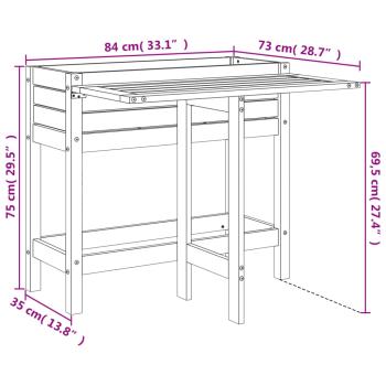 Stelle deine Lieblingsblumen oder -pflanzen in diesem Pflanzkübel mit Klapptisch schön zur Schau! Massives Kiefernholz: Der Pflanzkübel ist aus massivem Kiefernholz gefertigt, das für Robustheit und Stabilität sorgt. Massives Kiefernholz ist ein wunderschönes Naturmaterial. Kiefernholz weist eine gerade Maserung auf und die Aststellen verleihen dem Material seine charakteristische, rustikale Optik.Klapptisch: Dieser Pflanzkübel ist mit einem Klapptisch versehen, der reichlich Platz für alle Gartenarbeiten bietet. Bei Nichtgebrauch lässt sich die Tischplatte platzsparend zusammenklappen.Erhöhtes Design: Dieser Pflanzkasten schützt die Pflanzen vor Unkraut und Schädlingen. Dank des erhöhten Designs kannst du einen üppigen Garten anbauen, ohne dich jemals bücken zu müssen.Latten-Design: Das Latten-Design verhindert die Ansammlung von Wasser auf dem Pflanztisch, hält ihn trocken und verhindert Verrottung.Dekorative Funktion: Mit diesem Pflanzgefäß aus Holz kannst du deinen eigenen kleinen Garten anbauen. Es schafft eine lebendige Atmosphäre und stellt eine ideale Dekoration in deinem Wohnraum dar.