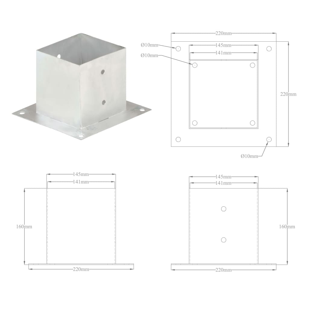 Mit unseren robusten Stützenschuhen können Sie nun Ihre Vierkantrohre am Boden sichern. Diese Pfostenanker sind für Vierkantrohre von 141 mm bestimmt. Diese Pfostenanker bestehen aus verzinktem Metall und sind daher rostbeständig. Sie lassen sich mit dem Boden verschrauben, um Ihre Stahlrohrstruktur in Position zu halten und eignen sich für harte Oberflächen wie Beton und Holz.