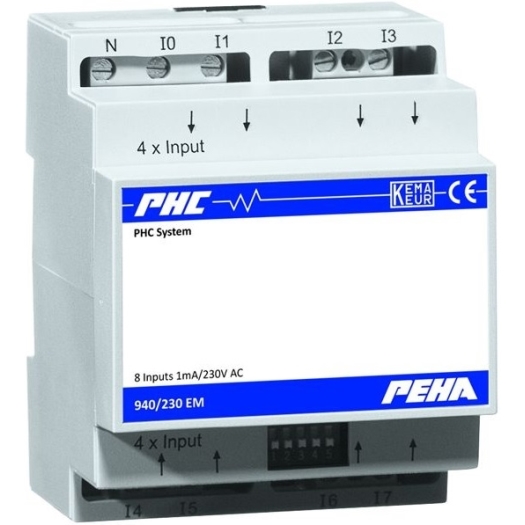 Das PHC Eingangsmodul 940/230 EM hat 8 Eingänge (I0 - I7) für Eingangssignale mit einer Spannung von 230V~/50-60 Hz. An jedem der Eingänge kann eine der 3