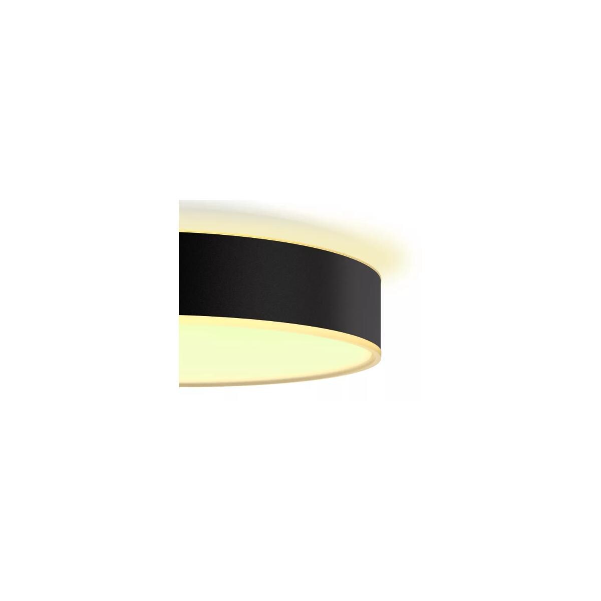 Die mittelgroße Hue Enrave Deckenleuchte in Schwarz erzeugt ein Licht aus Tausenden von Weißtönen. Sie ist für große Bereiche wie das Schlafzimmer geeignet. Diese einzigartig aussehende Lampe wirft ein indirektes Licht an die Decke und strahlt kräftig nach unten.